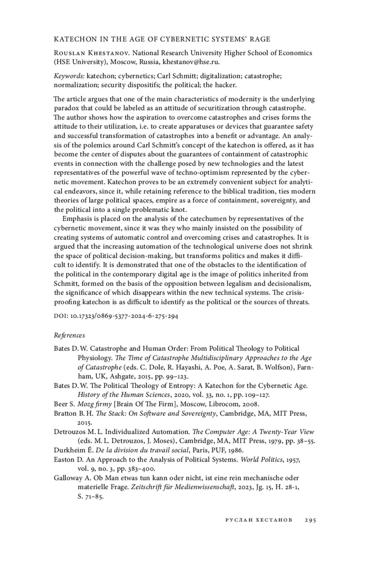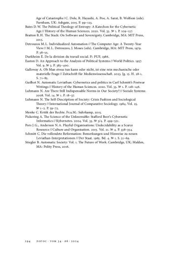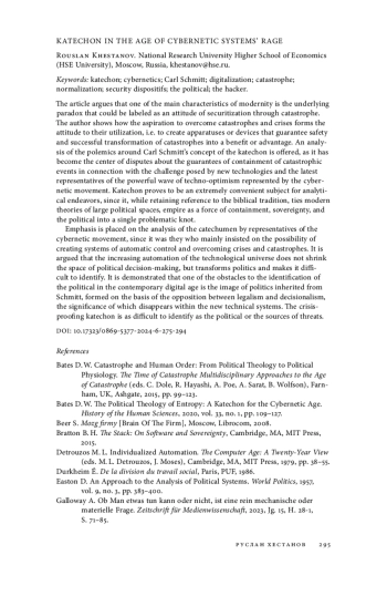 9. Bates D. W. The Political Theology of Entropy: A Katechon for the Cybernetic Age // History of the Human Sciences. 2020. Vol. 33. № 1. P. 109-127. EDN: RSJMAO