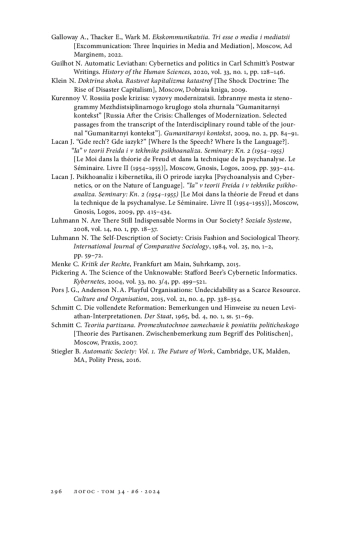 6. Лакан Ж. Психоанализ и кибернетика, или О природе языка // Он же. “Я” в теории Фрейда и в технике психоанализа. Семинары: Кн. 2 (1954- 1955) / Пер. с фр. А. Черноглазова. М.: Гнозис; Логос, 2009. С. 415-434.