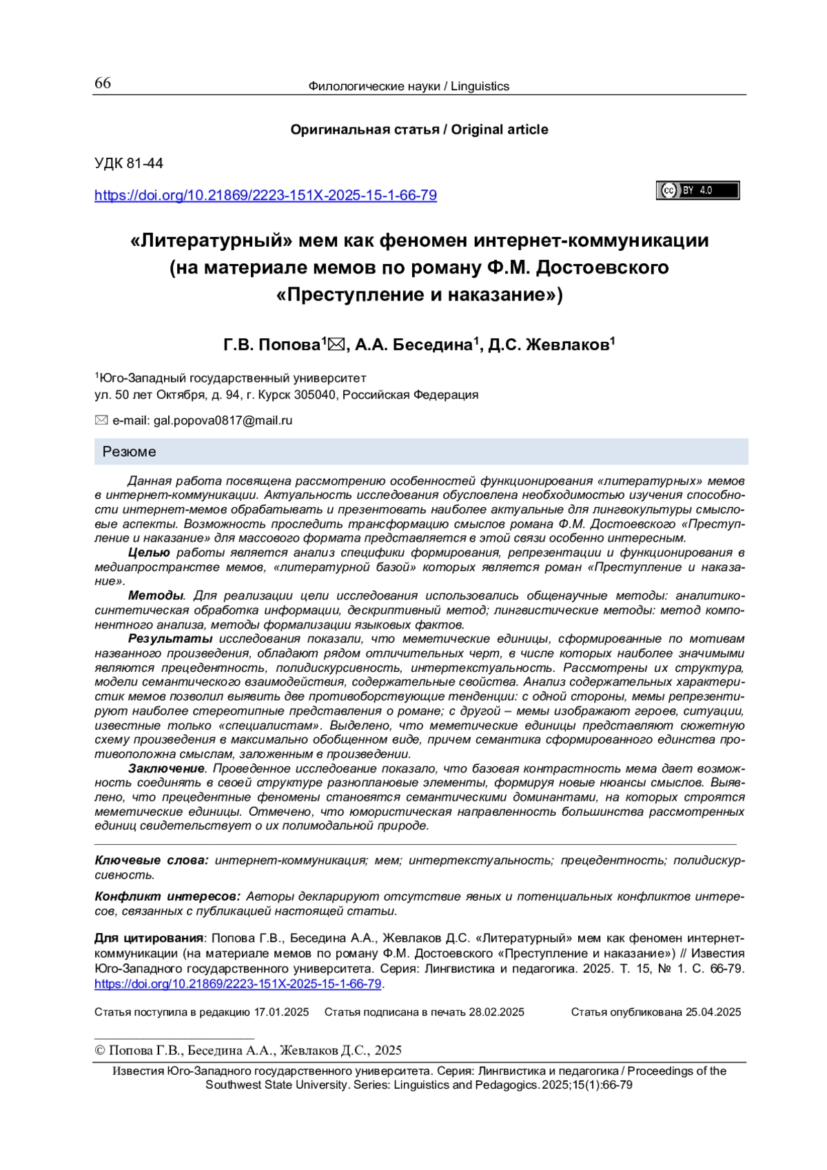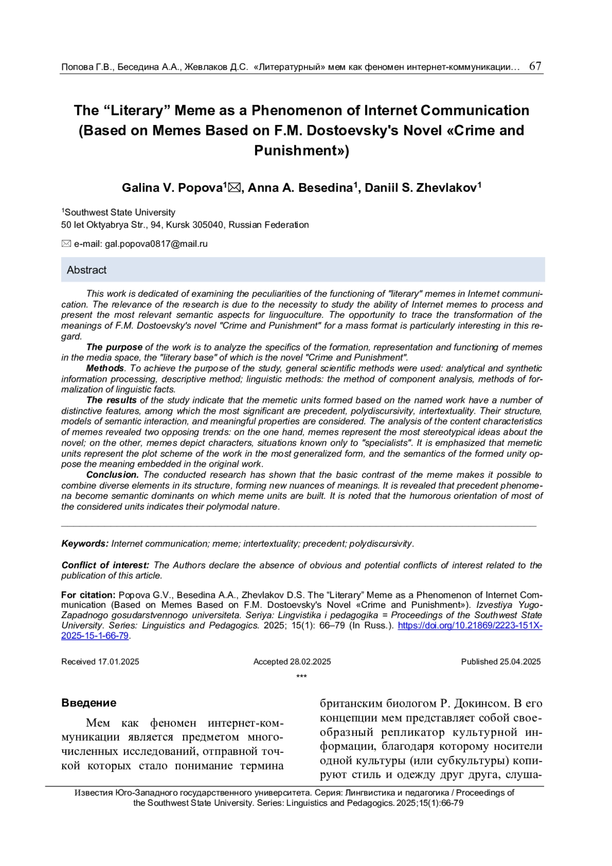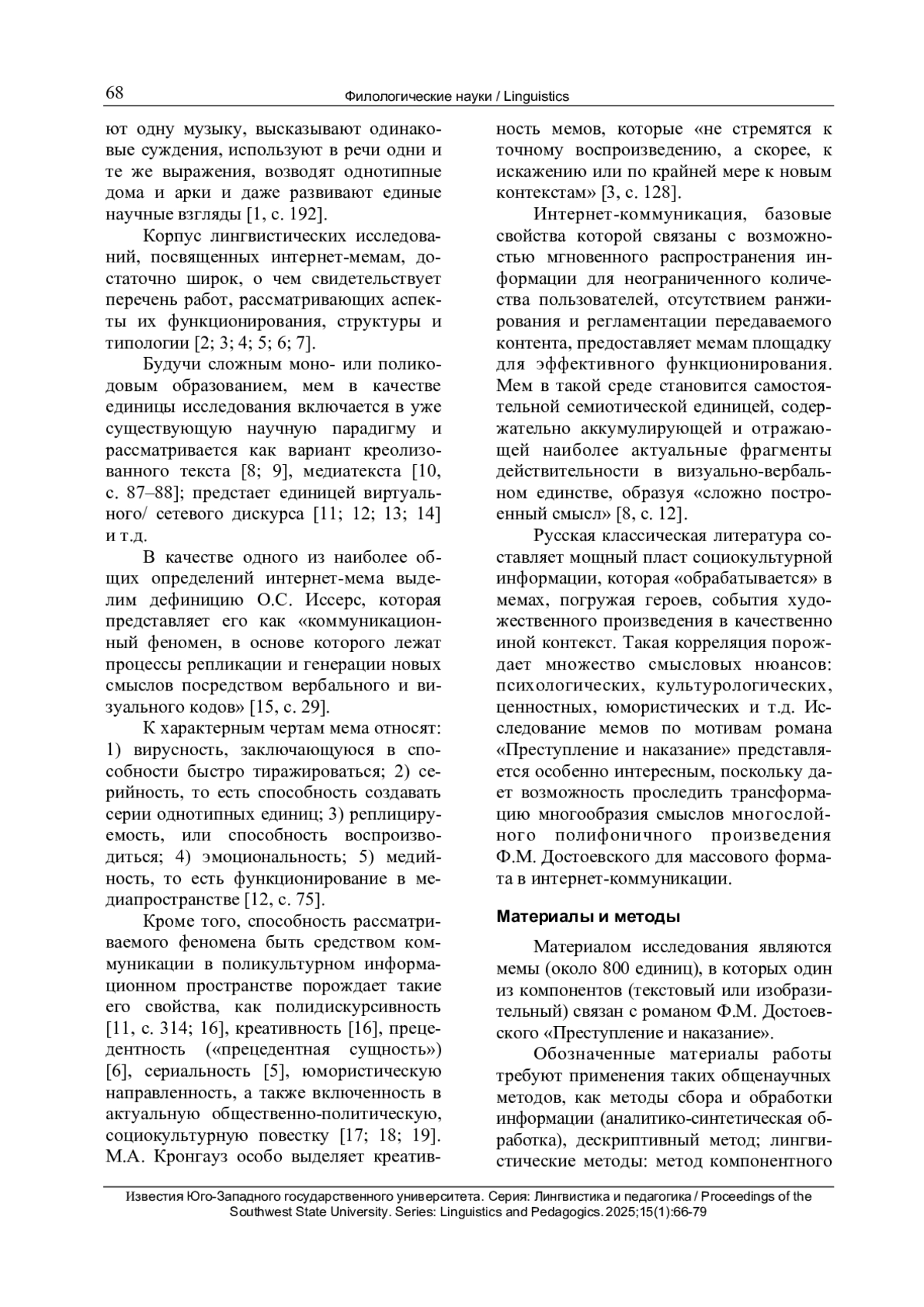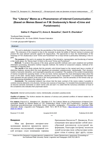 Данная работа посвящена рассмотрению особенностей функционирования «литературных» мемов в интернет-коммуникации. Актуальность исследования обусловлена необходимостью изучения способности интернет-мемов обрабатывать и презентовать наиболее актуальные для лингвокультуры смысловые аспекты. Возможность проследить трансформацию смыслов романа Ф. М. Достоевского «Преступление и наказание» для массового формата представляется в этой связи особенно интересным. Целью работы является анализ специфики формирования, репрезентации и функционирования в медиапространстве мемов, «литературной базой» которых является роман «Преступление и наказание». Методы. Для реализации цели исследования использовались общенаучные методы: аналитикосинтетическая обработка информации, дескриптивный метод; лингвистические методы: метод компонентного анализа, методы формализации языковых фактов. Результаты исследования показали, что меметические единицы, сформированные по мотивам названного произведения, обладают рядом отличительных черт, в числе которых наиболее значимыми являются прецедентность, полидискурсивность, интертекстуальность. Рассмотрены их структура, модели семантического взаимодействия, содержательные свойства. Анализ содержательных характеристик мемов позволил выявить две противоборствующие тенденции: с одной стороны, мемы репрезентируют наиболее стереотипные представления о романе; с другой – мемы изображают героев, ситуации, известные только «специалистам». Выделено, что меметические единицы представляют сюжетную схему произведения в максимально обобщенном виде, причем семантика сформированного единства противоположна смыслам, заложенным в произведении. Заключение. Проведенное исследование показало, что базовая контрастность мема дает возможность соединять в своей структуре разноплановые элементы, формируя новые нюансы смыслов. Выявлено, что прецедентные феномены становятся семантическими доминантами, на которых строятся меметические единицы. Отмечено, что юмористическая направленность большинства рассмотренных единиц свидетельствует о их полимодальной природе