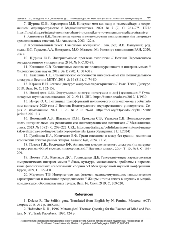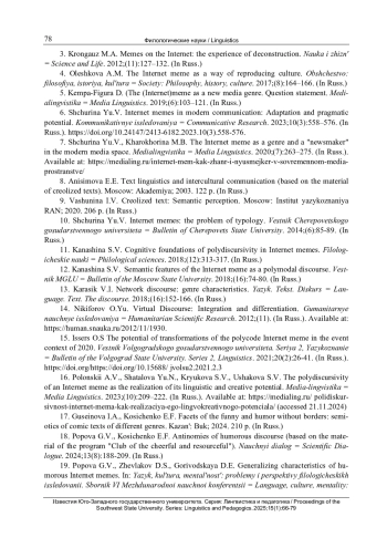 15. Иссерс О. С. Потенциал трансформаций поликодового интернет-мема в событийном контексте 2020 года // Вестник Волгоградского государственного университета. Серия 2, Языкознание. 2021. Т. 20, № 2. С. 26-41. DOI: 10.15688/jvolsu2.2021.2.3 EDN: ONCAHZ