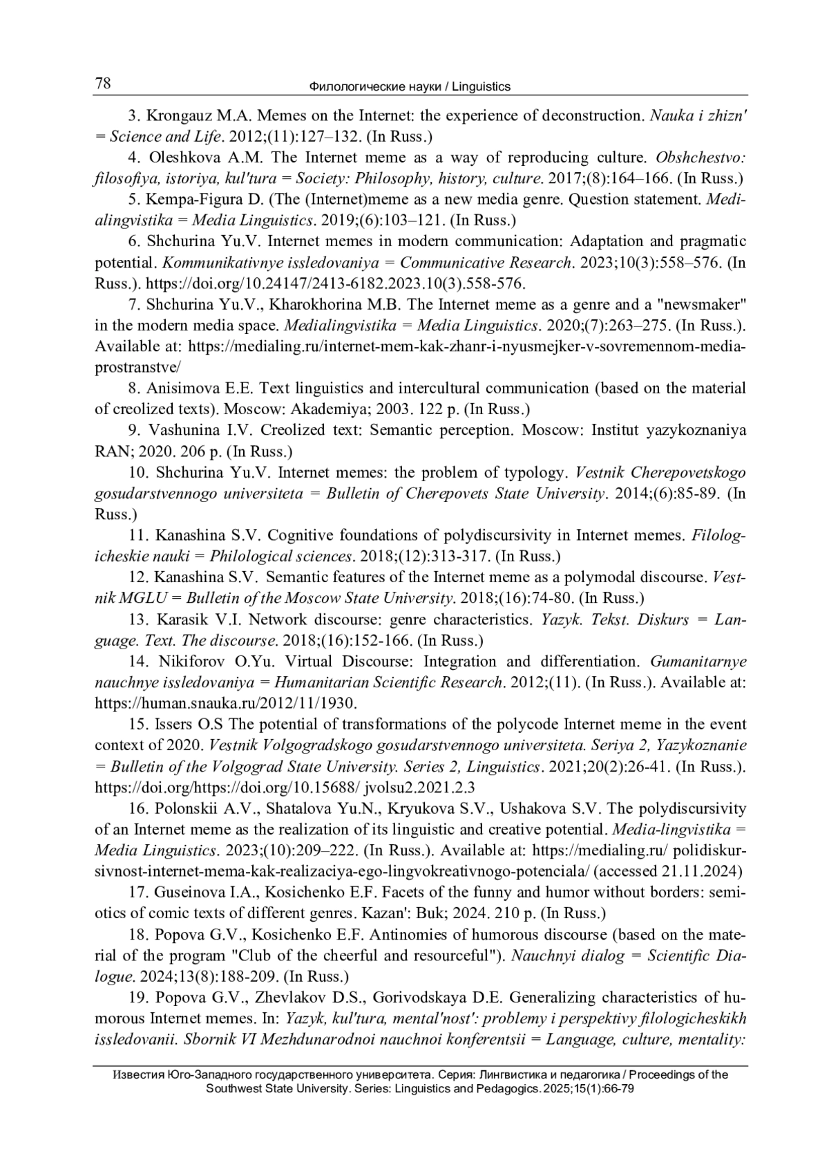 12. Канашина С.В. Семантические особенности интернет-мема как полимодального дискурса // Вестник МГЛУ. 2018. № 16 (811). С. 74-80.