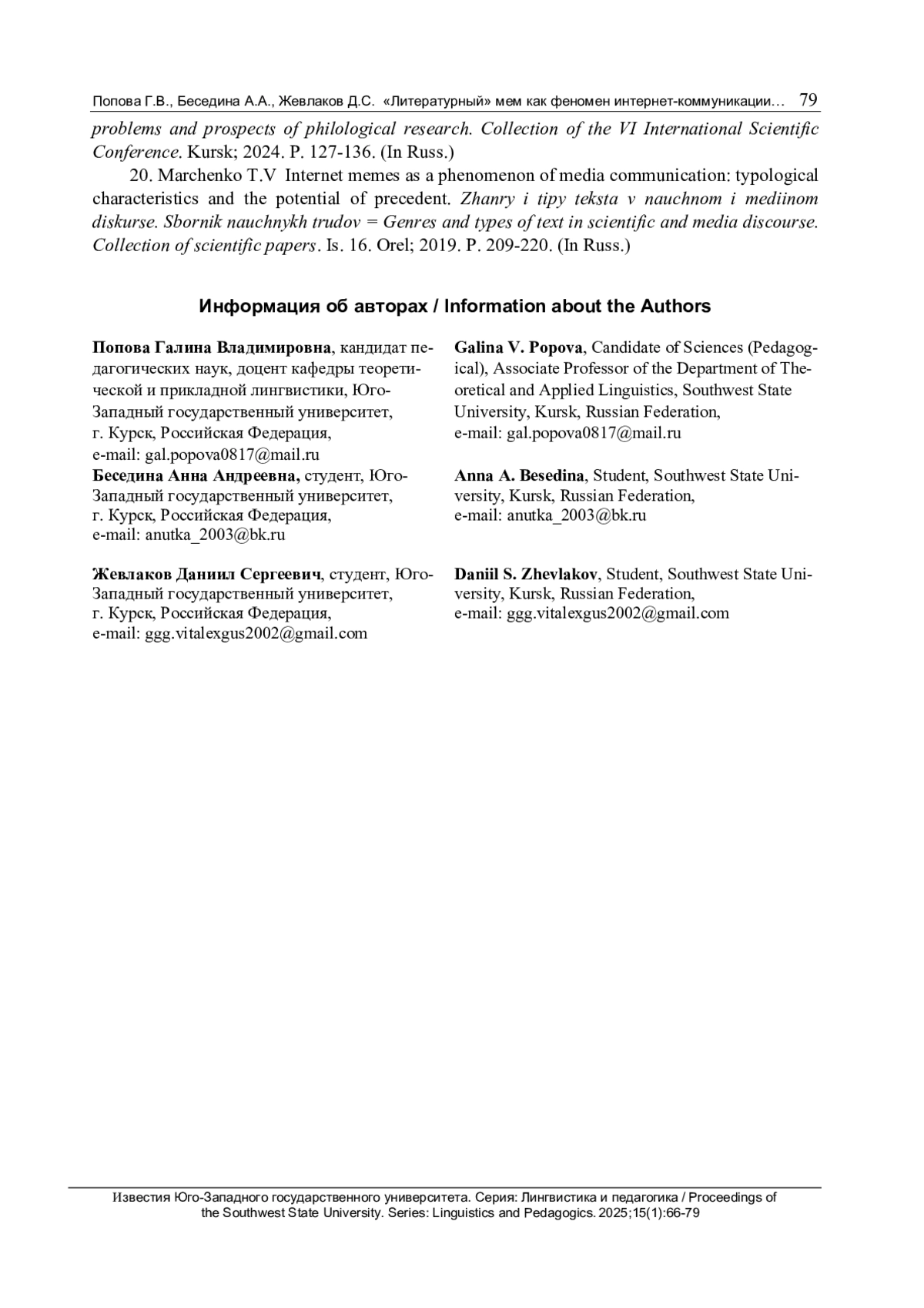 19. Попова Г.В., Жевлаков Д.С., Гориводская Д.Е. Генерализующие характеристики юмористических интернет-мемов // Язык, культура, ментальность: проблемы и перспективы филологических исследований: сборник VI Международной научной конференции. Курск, 2024. С. 127-136. EDN: NCWAUP