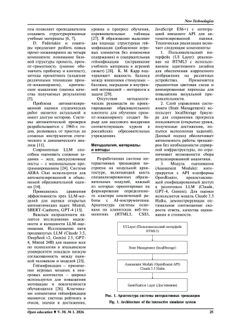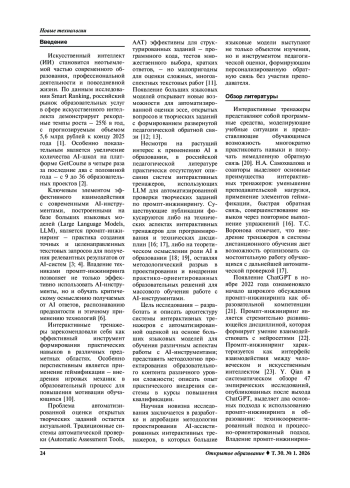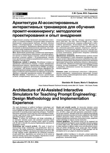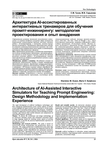 Стремительное развитие технологий искусственного интеллекта и их широкое внедрение в различные сферы человеческой деятельности актуализируют проблему массового обучения работе с AI-инструментами, в частности, освоения техник промпт-инжиниринга. Традиционные образовательные подходы не успевают за темпами технологических изменений, что создает разрыв между потребностями рынка труда и компетенциями выпускников образовательных программ. Цель. Представить архитектуру и методологию проектирования системы интерактивных тренажеров с автоматизированной оценкой на основе больших языковых моделей для обучения различным аспектам работы с AI-инструментами; описать опыт практического внедрения разработанной системы в курсы повышения квалификации. Методология, методы и методики. Исследование основано на методологии педагогического дизайна и теории геймификации образовательного процесса. Архитектура системы реализована с использованием клиентских веб-технологий (HTML5, JavaScript) и интеграции с API больших языковых моделей (OpenRouter) для автоматизированной проверки открытых заданий. Апробация проведена в контексте курсов повышения квалификации по программе «Введение в нейросети: практическое освоение AI-платформ». Научная новизна. Разработана и описана архитектура системы интерактивных тренажеров, включающая шесть специализированных модулей: техники промпт-инжиниринга (Zero-shot, Few-shot, Chain-of-Thought и др.), этика искусственного интеллекта, генерация изображений и видео, создание презентаций, AI-аналитика данных. Научная новизна заключается в применении больших языковых моделей для автоматизированной проверки творческих заданий с формированием развернутой обратной связи без участия преподавателя. Система интегрирует механизмы геймификации (система достижений, прогрессивное открытие контента) для повышения мотивации. Практическая значимость. Представленная система может быть интегрирована в курсы повышения квалификации и программы высшего образования в различных предметных областях. Модульная архитектура обеспечивает возможность адаптации тренажеров под различные предметные области и образовательные контексты. Определены направления дальнейшего развития системы, включая интеграцию с LMS через SCORM-пакеты и разработку собственного плагина для аналитики образовательного процесса.