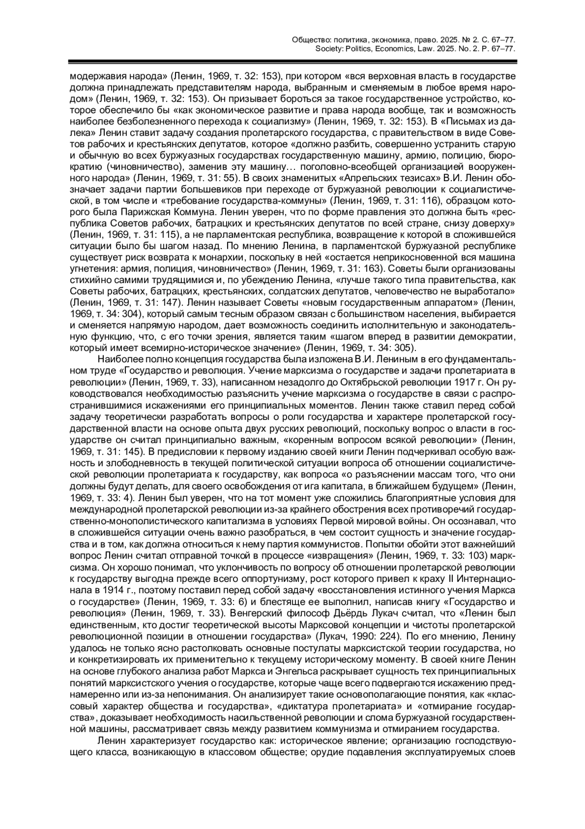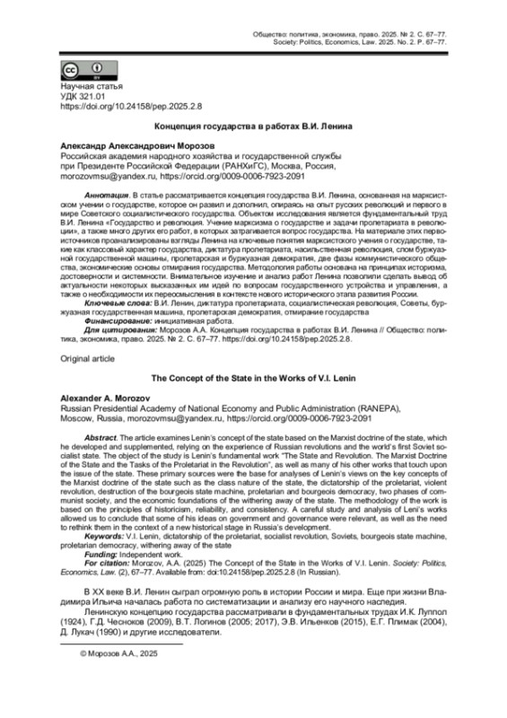 В статье рассматривается концепция государства В. И. Ленина, основанная на марксистском учении о государстве, которое он развил и дополнил, опираясь на опыт русских революций и первого в мире Советского социалистического государства. Объектом исследования является фундаментальный труд В. И. Ленина «Государство и революция. Учение марксизма о государстве и задачи пролетариата в революции», а также много других его работ, в которых затрагивается вопрос государства. На материале этих первоисточников проанализированы взгляды Ленина на ключевые понятия марксистского учения о государстве, такие как классовый характер государства, диктатура пролетариата, насильственная революция, слом буржуазной государственной машины, пролетарская и буржуазная демократия, две фазы коммунистического общества, экономические основы отмирания государства. Методология работы основана на принципах историзма, достоверности и системности. Внимательное изучение и анализ работ Ленина позволили сделать вывод об актуальности некоторых высказанных им идей по вопросам государственного устройства и управления, а также о необходимости их переосмысления в контексте нового исторического этапа развития России.