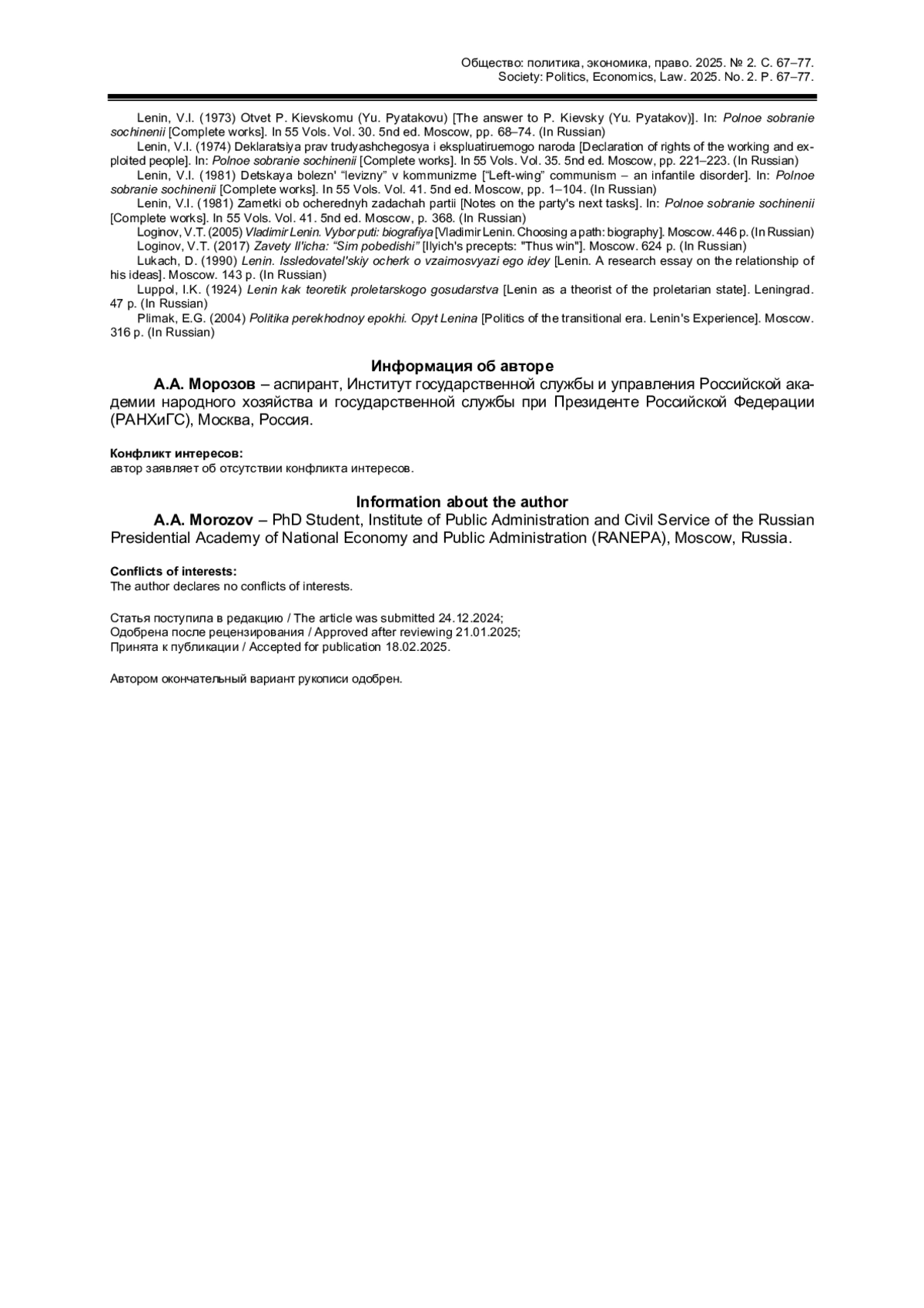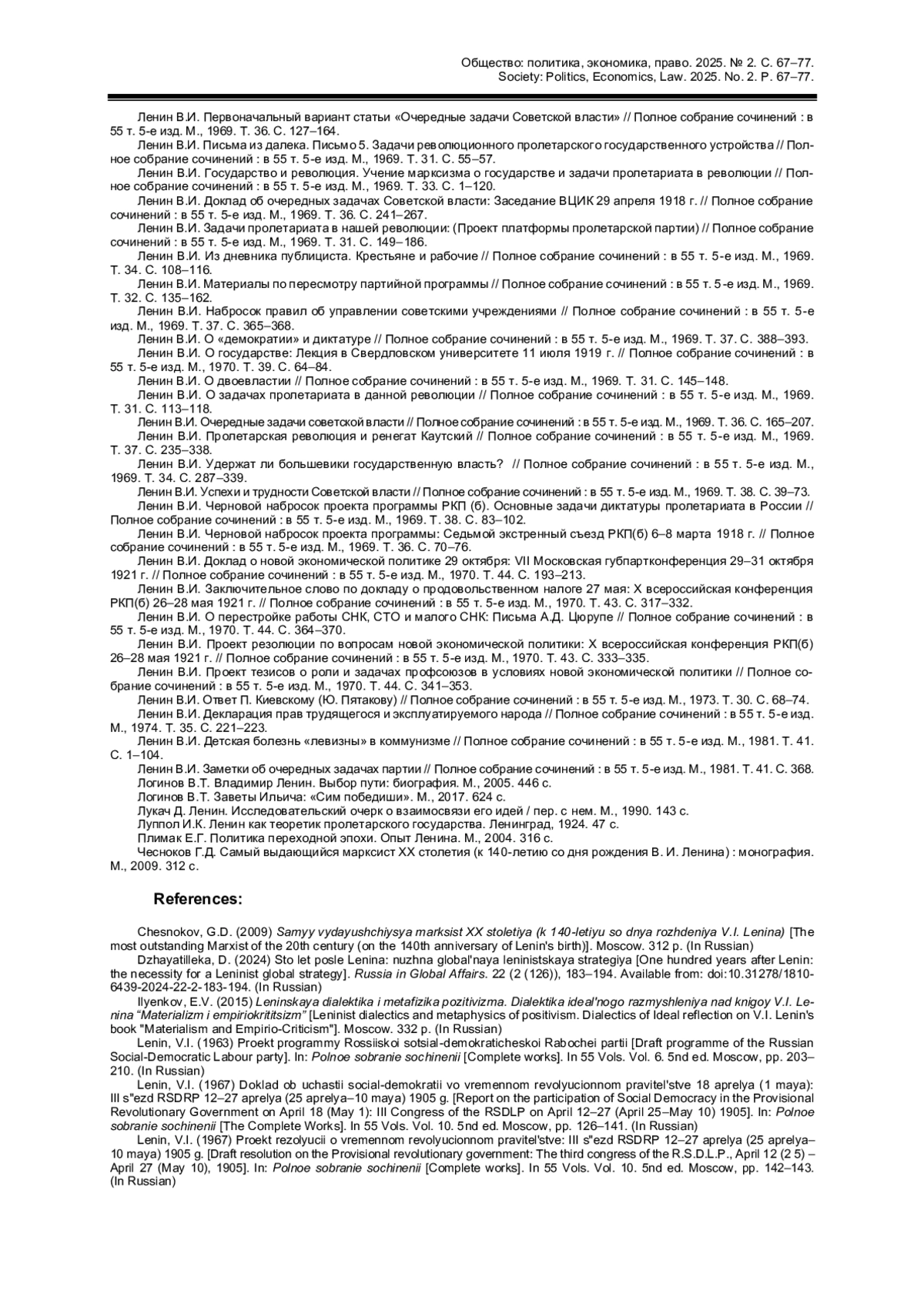 1. Джаятиллека Д. Сто лет после Ленина: нужна глобальная ленинистская стратегия // Россия в глобальной политике. 2024. Т. 22, № 2 (126). С. 183-194. DOI: 10.31278/1810-6439-2024-22-2-183-194 EDN: CENYUQ