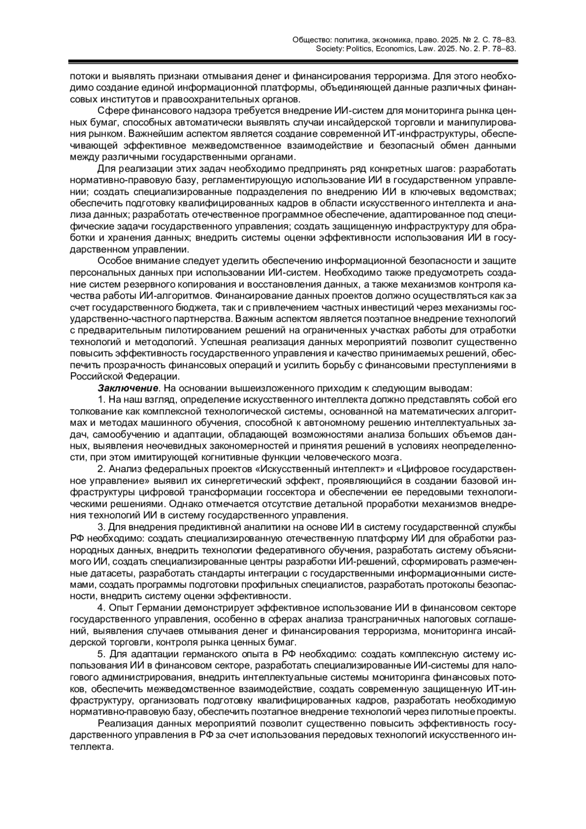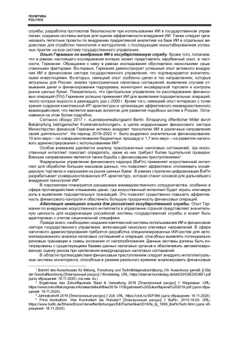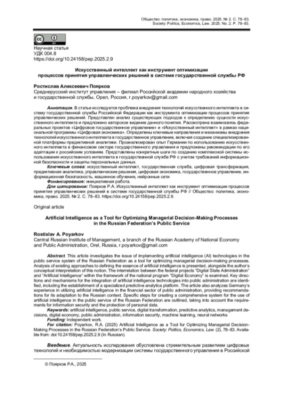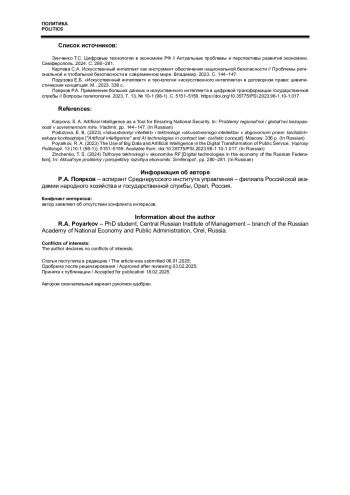 4. Поярков Р.А. Применение больших данных и искусственного интеллекта в цифровой трансформации государственной службы // Вопросы политологии. 2023. Т. 13, № 10-1 (98-1). С. 5151-5159. DOI: 10.35775/PSI.2023.98-1.10-1.017 EDN: VLFAHA