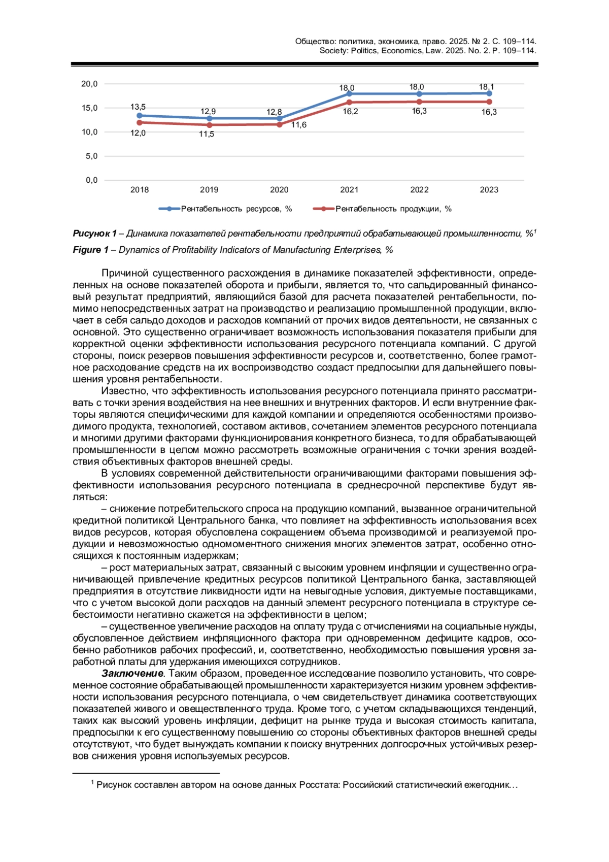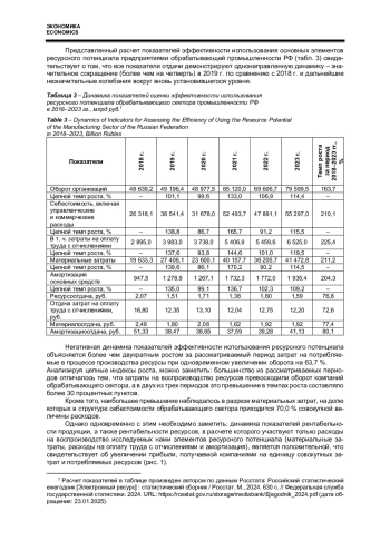 Полученные результаты свидетельствуют о наличии схожей динамики оцениваемых показателей в период 2018-2023 гг., которая проявляется в существенном их сокращении в 2019 г. и стабилизации на новом низком уровне, причиной которого являлся опережающий рост стоимости потребляемых ресурсов по отношению к объему реализуемой продукции.