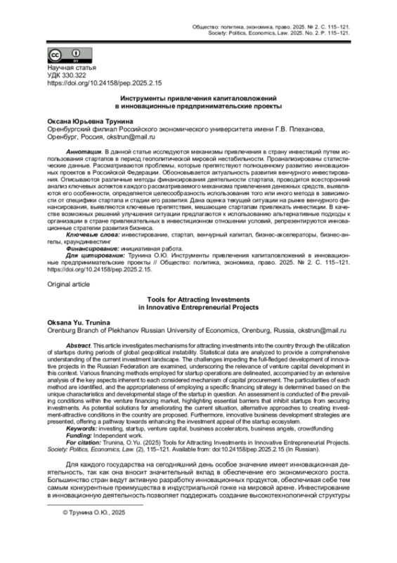 В данной статье исследуются механизмы привлечения в страну инвестиций путем использования стартапов в период геополитической мировой нестабильности. Проанализированы статистические данные. Рассматриваются проблемы, которые препятствуют полноценному развитию инновационных проектов в Российской Федерации. Обосновывается актуальность развития венчурного инвестирования. Описываются различные методы финансирования деятельности стартапа, проводится всесторонний анализ ключевых аспектов каждого рассматриваемого механизма привлечения денежных средств, выявляются его особенности, определяется целесообразность использования того или иного метода в зависимости от специфики стартапа и стадии его развития. Дана оценка текущей ситуации на рынке венчурного финансирования, выявляются ключевые препятствия, мешающие стартапам привлекать инвестиции. В качестве возможных решений улучшения ситуации предлагаются к использованию альтернативные подходы к организации в стране привлекательных в инвестиционном отношении условий, репрезентируются инновационные стратегии развития бизнеса.