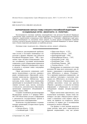 Сложность рассматриваемой проблематики состоит в постоянно меняющихся технологиях и формах общения глав субъектов Российской Федерации (далее – РФ) с населением через интернет-коммуникации. Анализ сегодняшнего состояния использования социальных сетей губернаторами проводится на примере Сибирского федерального округа и сводится к изучению самых популярных мессенджеров.