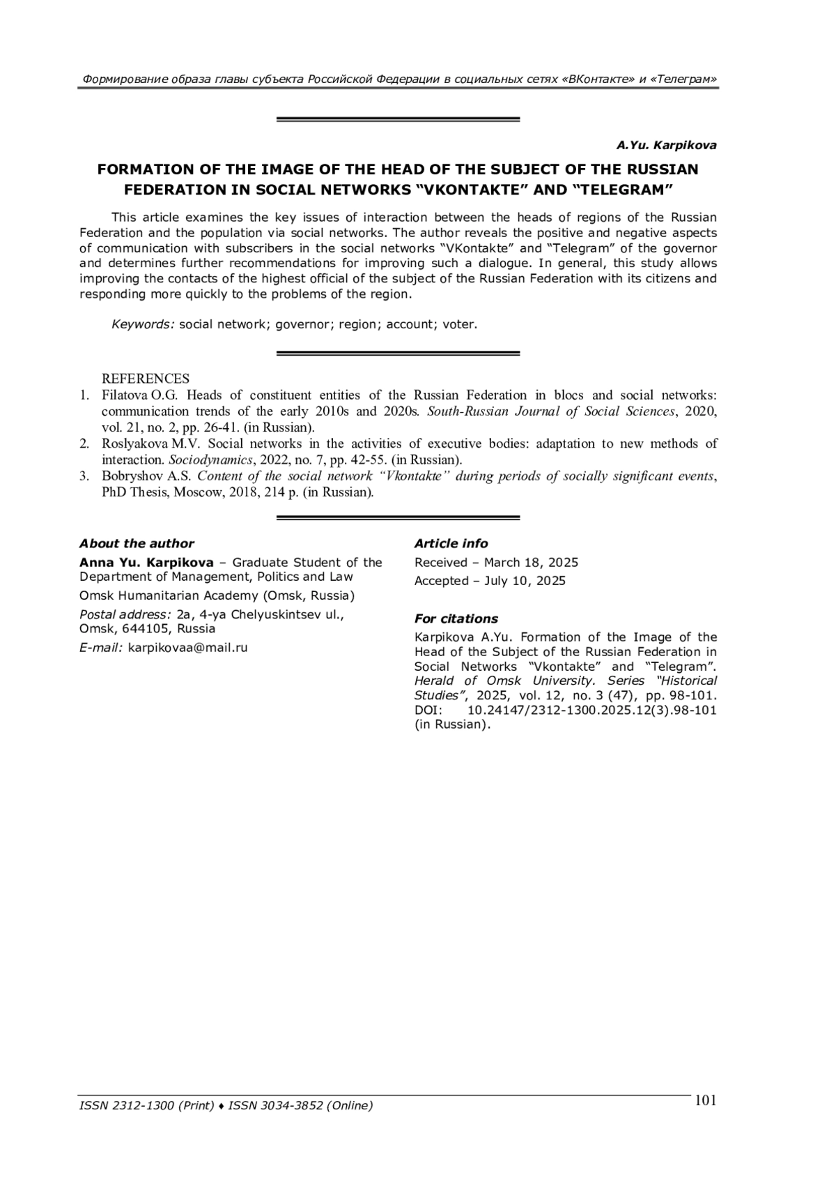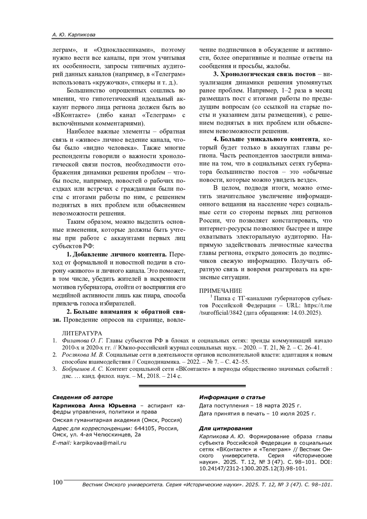 1. Филатова О. Г. Главы субъектов РФ в блоках и социальных сетях: тренды коммуникаций начало 2010-х и 2020-х гг. // Южно-российский журнал социальных наук. - 2020. - Т. 21, № 2. - С. 26-41. EDN: HHPNZZ