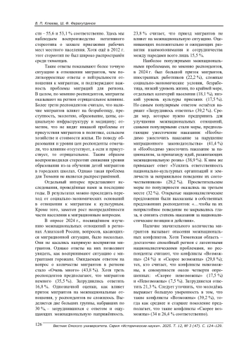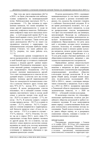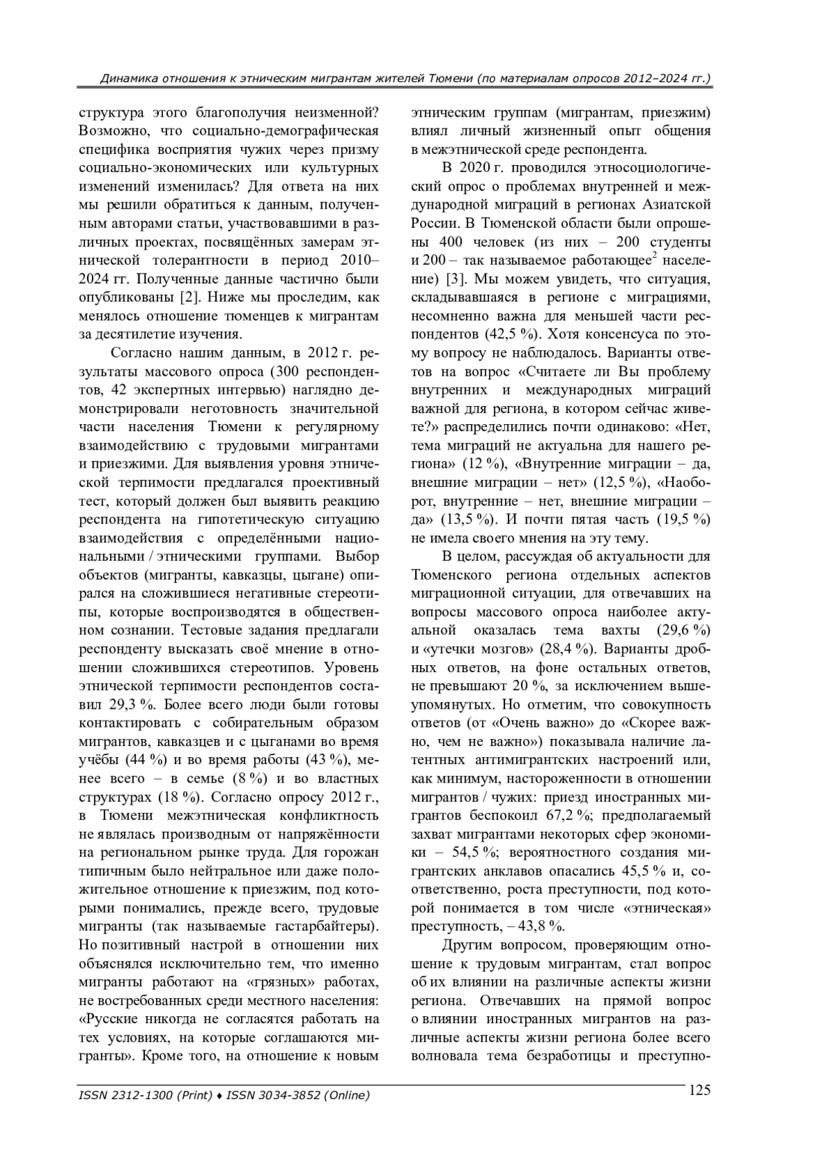Представлена динамика изменения миграционных установок среди населения Тюменской области. Работа опирается на результаты массовых опросов населения, проведённых за последние 12 лет при участии авторов. Показано, что, несмотря на сохранение стабильности нейтрально-положительной тональности в сфере межнациональных и межконфессиональных отношений, произошло изменение восприятия мигрантов. Данные изменения по-разному проявляются в различных социально-демографических группах и подчёркивают необходимость продолжения исследований в данной области с учётом внутри- и внешнеполитической ситуации.
