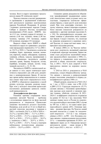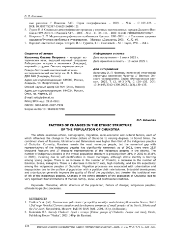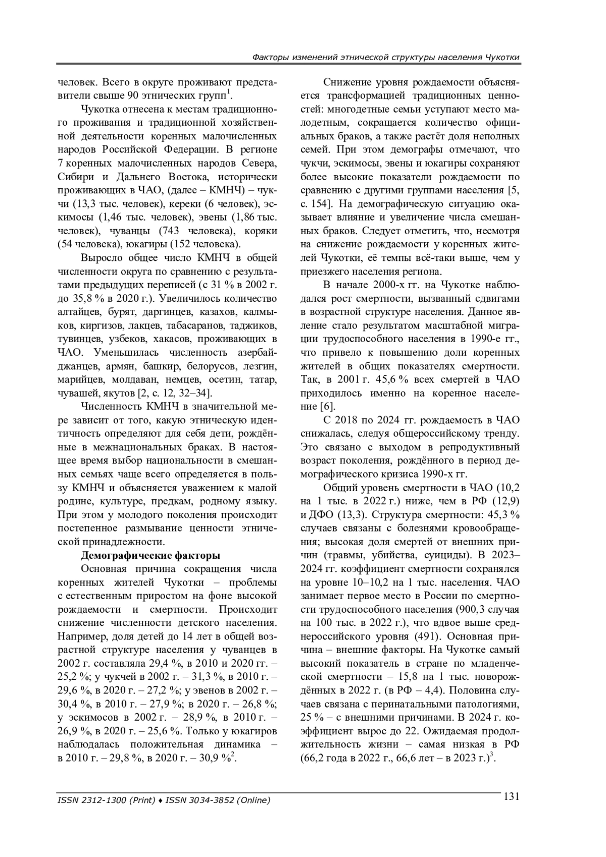 Этническая структура населения Чукотки формировалась и эволюционировала под воздействием комплекса факторов, среди которых природно-климатические особенности региона, исторические миграционные процессы, государственно-политическое регулирование и социально-экономические трансформации. В рамках данного исследования рассматриваются факторы, обусловившие динамику этнической структуры и её современное состояние. Методологическую основу работы составили анализ статистических данных, материалы переписей населения, а также научные публикации в области этнодемографии, социологии и этнографии, посвящённые изучению народов Чукотки.