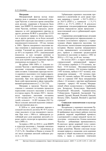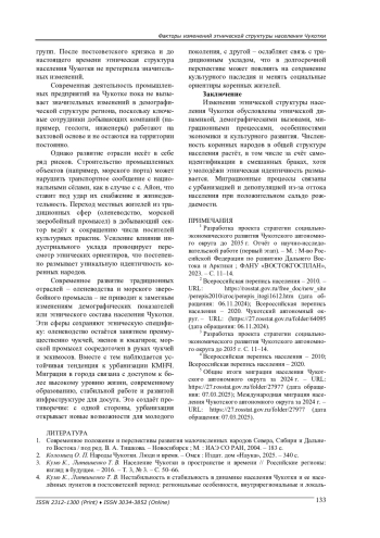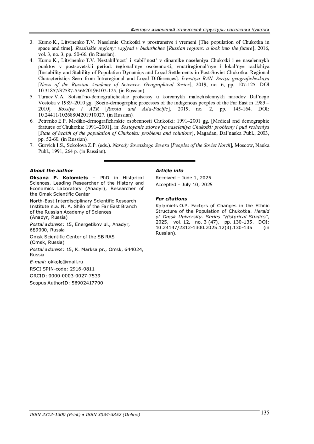 4. Кумо К., Литвиненко Т. В. Нестабильность и стабильность в динамике населения Чукотки и ее населённых пунктов в постсоветский период: региональные особенности, внутрирегиональные и локальные различия // Известия РАН. Серия географическая. - 2019. - № 6. - С. 107-125. -. DOI: 10.31857/S2587-556620196107-125 EDN: RSMTKG