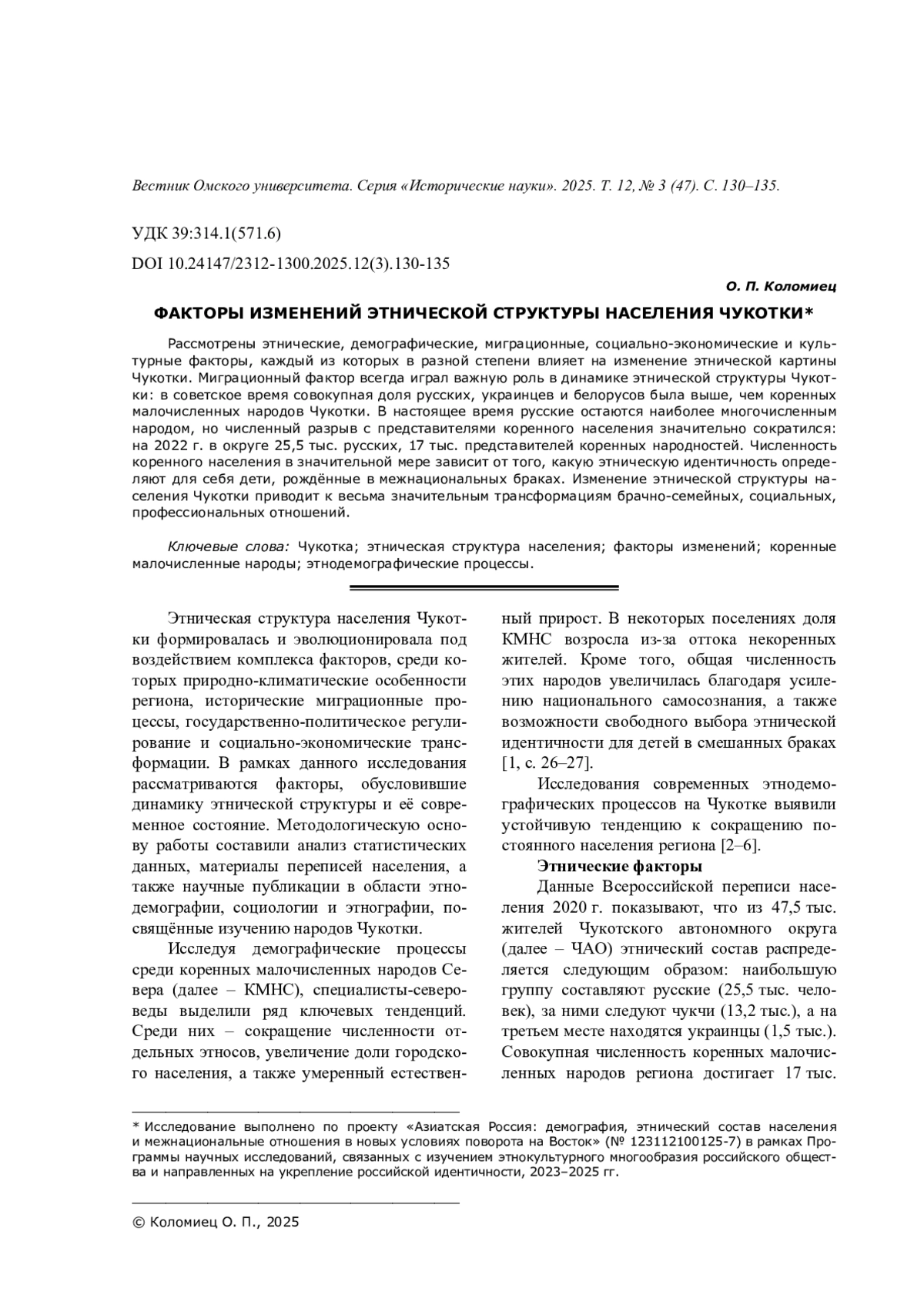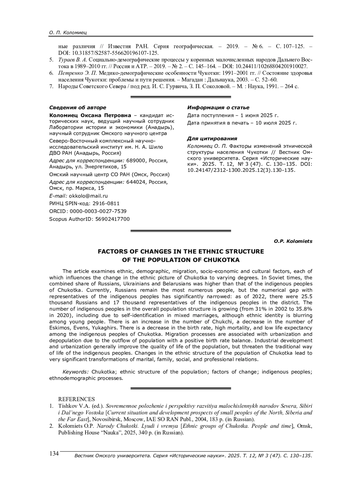 2. Коломиец О. П. Народы Чукотки. Люди и время. - Омск: Издат. дом “Наука”, 2025. - 340 с. EDN: YCFESZ