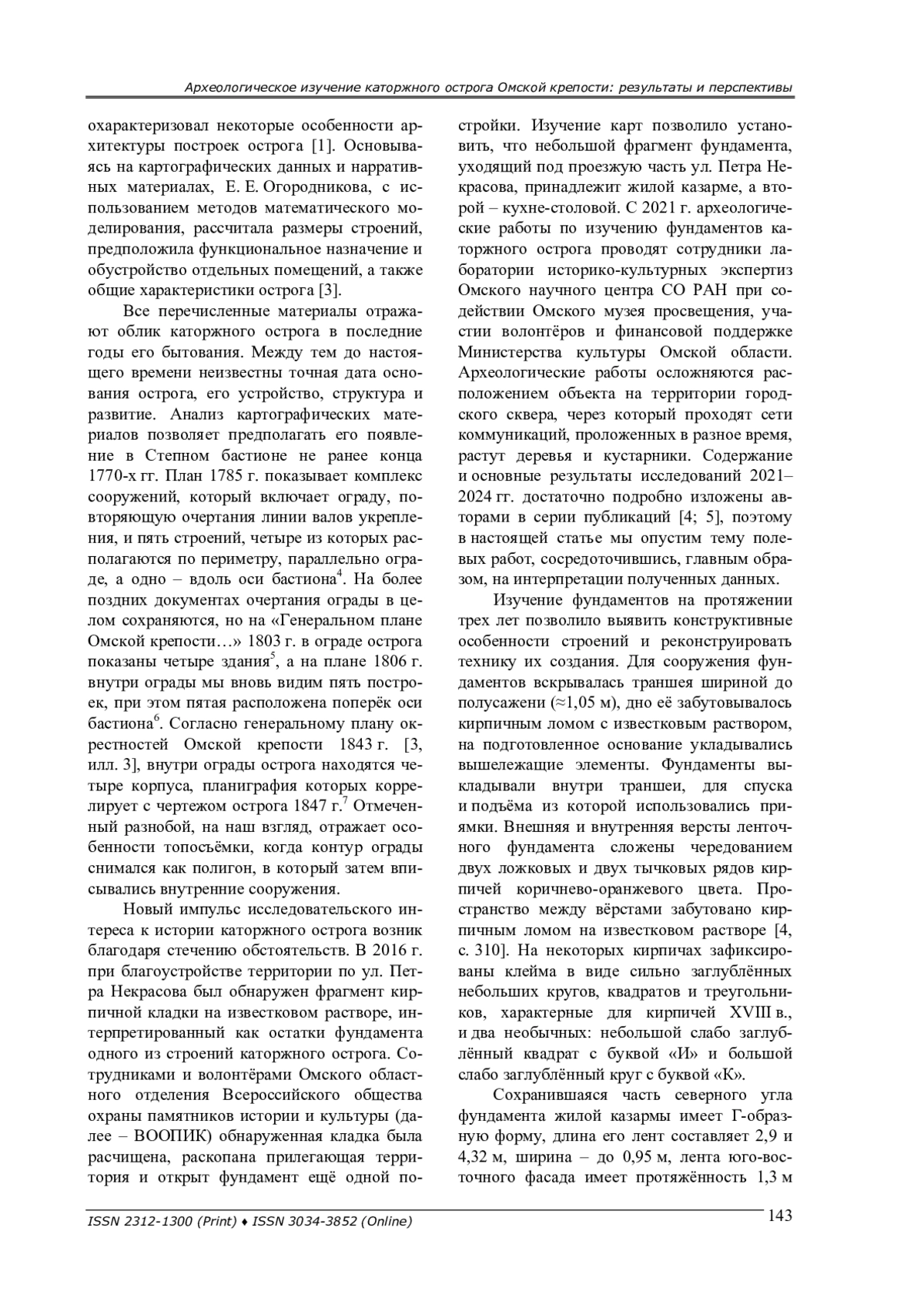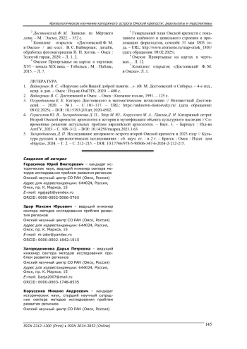 5. Загородникова Д. П. Исследование каторжного острога второй Омской крепости в 2023 году // Культура русских в археологических исследованиях: сб. науч. ст.: в 2 т. - Братск; Омск: Издат. дом “Наука”, 2024. - Т. 2. - С. 212-215. -. DOI: 10.17746/978-5-98806-347-6-2024-2-212-215 EDN: WUSMPU