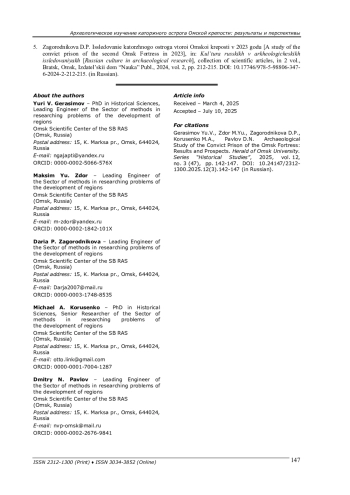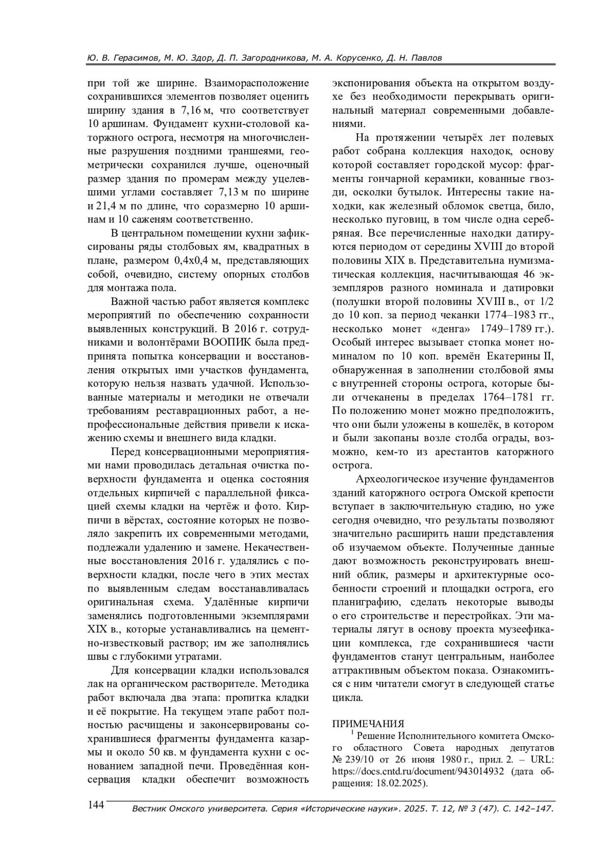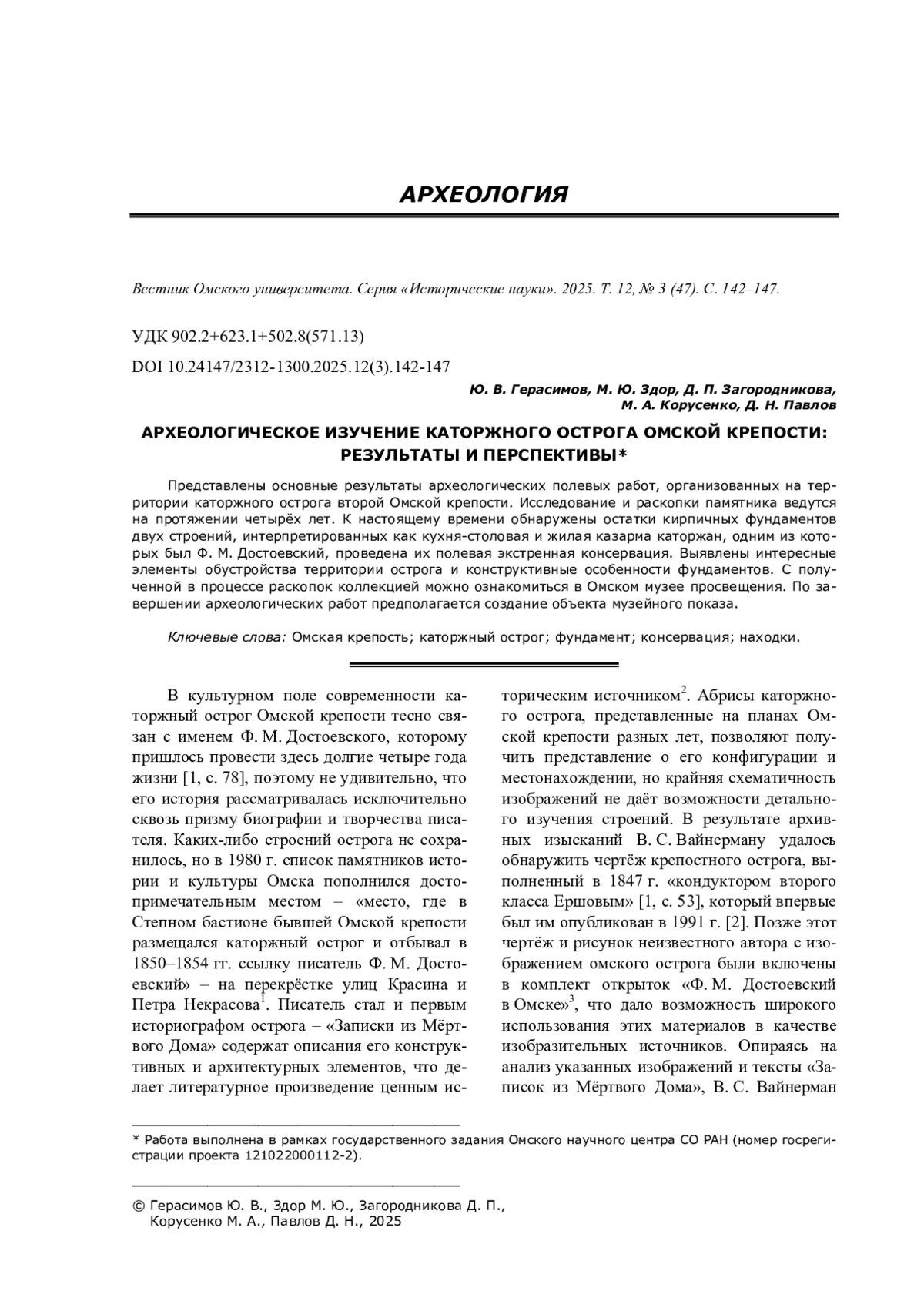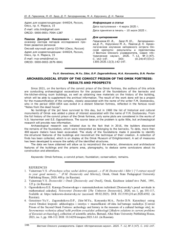 4. Герасимов Ю. В., Загородникова Д. П., Здор М. Ю., Корусенко М. А., Павлов Д. Н. Каторжный острог Второй Омской крепости: археология и история в музеефикации объекта культурного наследия // Современные решения актуальных проблем евразийской археологии. - Вып. 3. - Барнаул: Изд-во АлтГУ, 2023.- С. 308-312. -. DOI: 10.14258/msapea.2023.3.63 EDN: ZTDFYI
