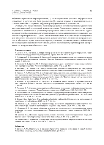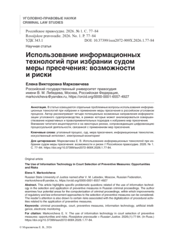 8. Markovicheva, E. V. Intelligent decision support in criminal court. Izvestiya Yugo-Zapadnogo gosudarstvennogo universiteta. Ser.: Istoriya i pravo = Proceedings of The South-West State University. Series: History and Law. 2021;1(6):97-108. (In Russ.).