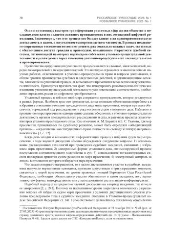 Одним из основных векторов трансформации различных сфер жизни общества в последнее десятилетие является активное проникновение в них достижений цифровой революции. Закономерно, что этот процесс все больше влияет и на правоприменительную деятельность в целом, и на уголовное судопроизводство в частности. В рамках последнего современные технологии позволяют решить ряд социально важных задач, связанных с обеспечением доступа граждан к правосудию, повышением открытости судебной системы, оптимизацией некоторых параметров собственно уголовно-процессуальной деятельности и реализуемых через изменение уголовно-процессуального законодательства и правоприменения.