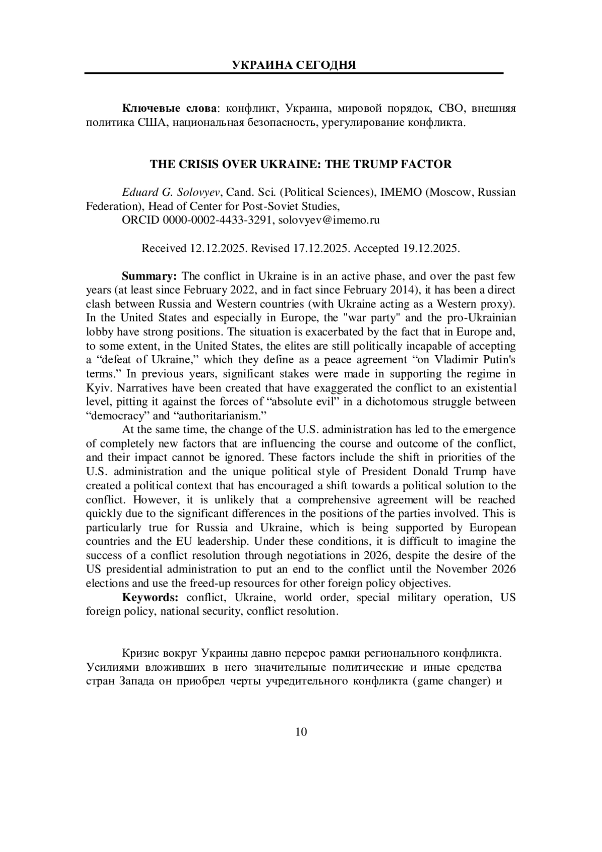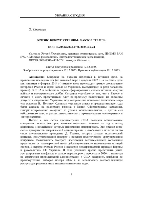 1. Соловьев Э.Г. 2024. Украинский кризис: новый этап эскалации // Россия и новые государства Евразии. № 4. С. 9-22.