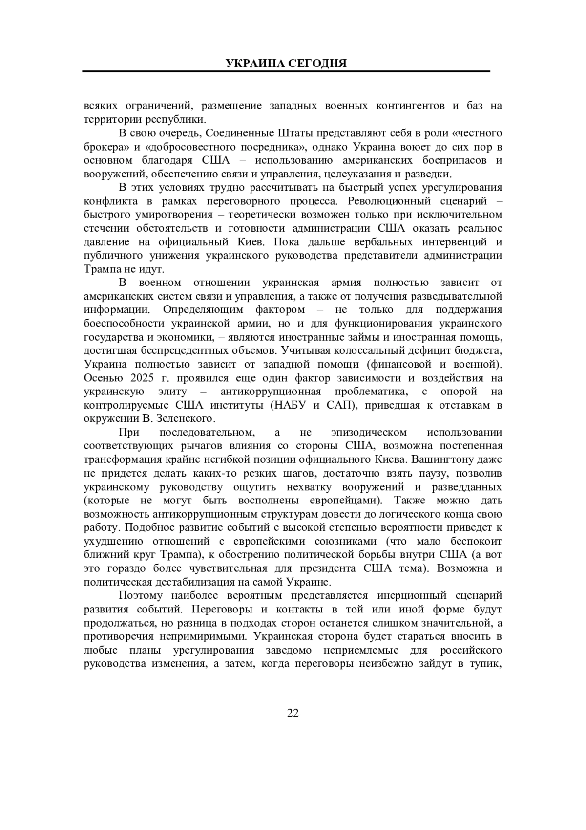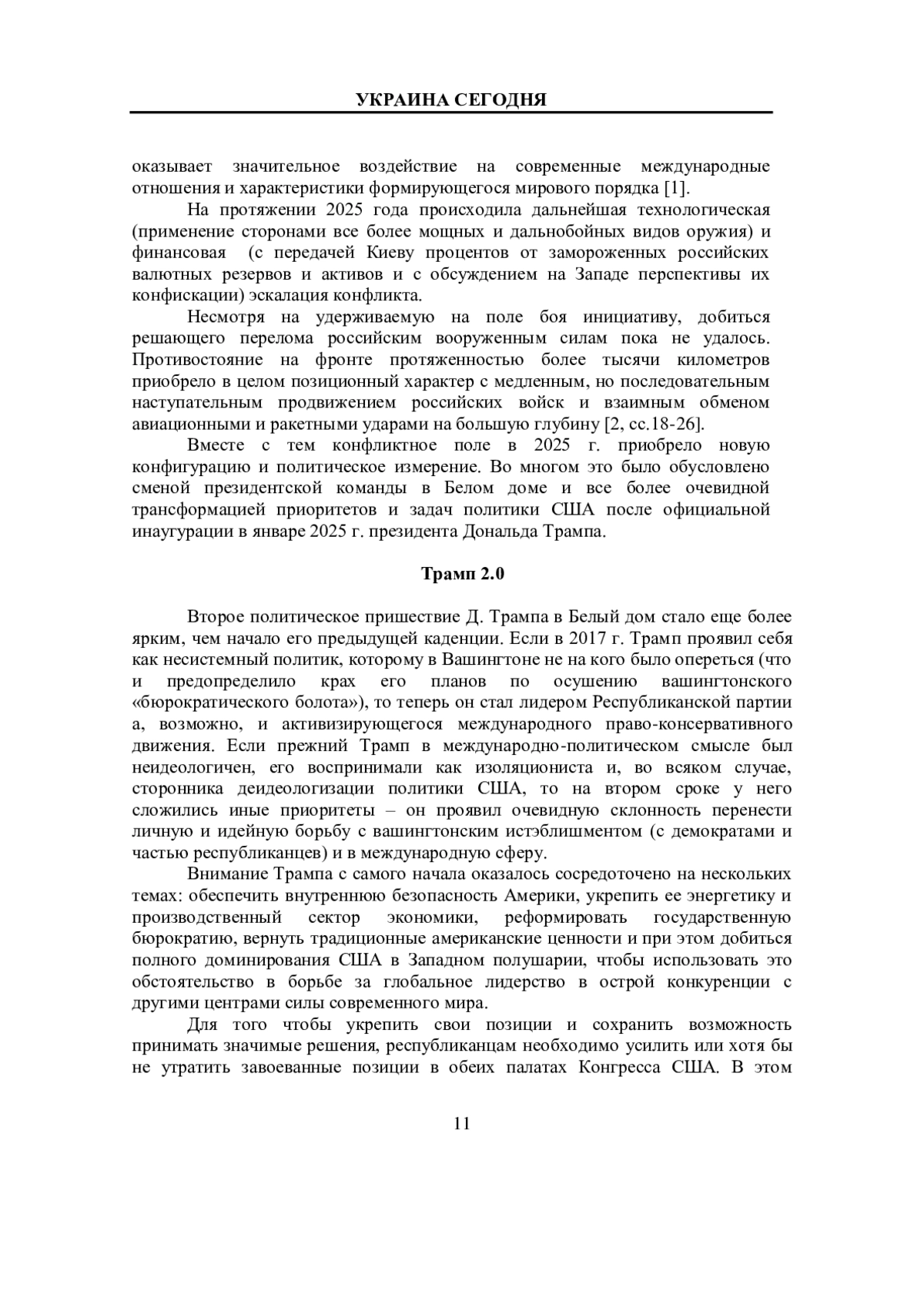 Вместе с тем смена администрации США повлекла возникновение совершенно новых факторов, которые оказывают влияние на ход и исход конфликта и воздействие которых невозможно игнорировать. Это прежде всего смена приоритетов американской администрации и особенности политического стиля американского президента Д. Трампа, которые создали политический контекст, стимулировавший поворот к поискам политического урегулирования конфликта. Возможность быстрого достижения всеобъемлющего соглашения представляется маловероятной из-за субстанционального несовпадения позиций сторон. В первую очередь России и всемерно поддерживаемой странами Европы и руководством ЕС Украины. В этих условиях трудно представить успех урегулирования конфликта в рамках переговорного процесса в 2026 г., несмотря на стремление президентской администрации в США завершить конфликт до промежуточных выборов ноября 2026 г. и использовать высвободившиеся ресурсы для решения иных внешнеполитических задач.