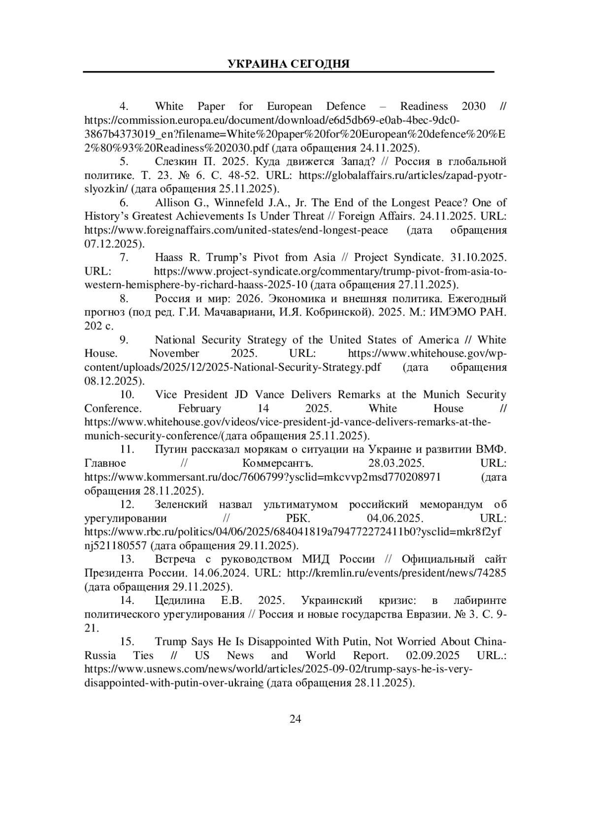 5. Слезкин П. 2025. Куда движется Запад? // Россия в глобальной политике. Т. 23. № 6. С. 48-52. URL: https://globalaffairs.ru/articles/zapad-pyotr-slyozkin/(дата обращения 25.11.2025).