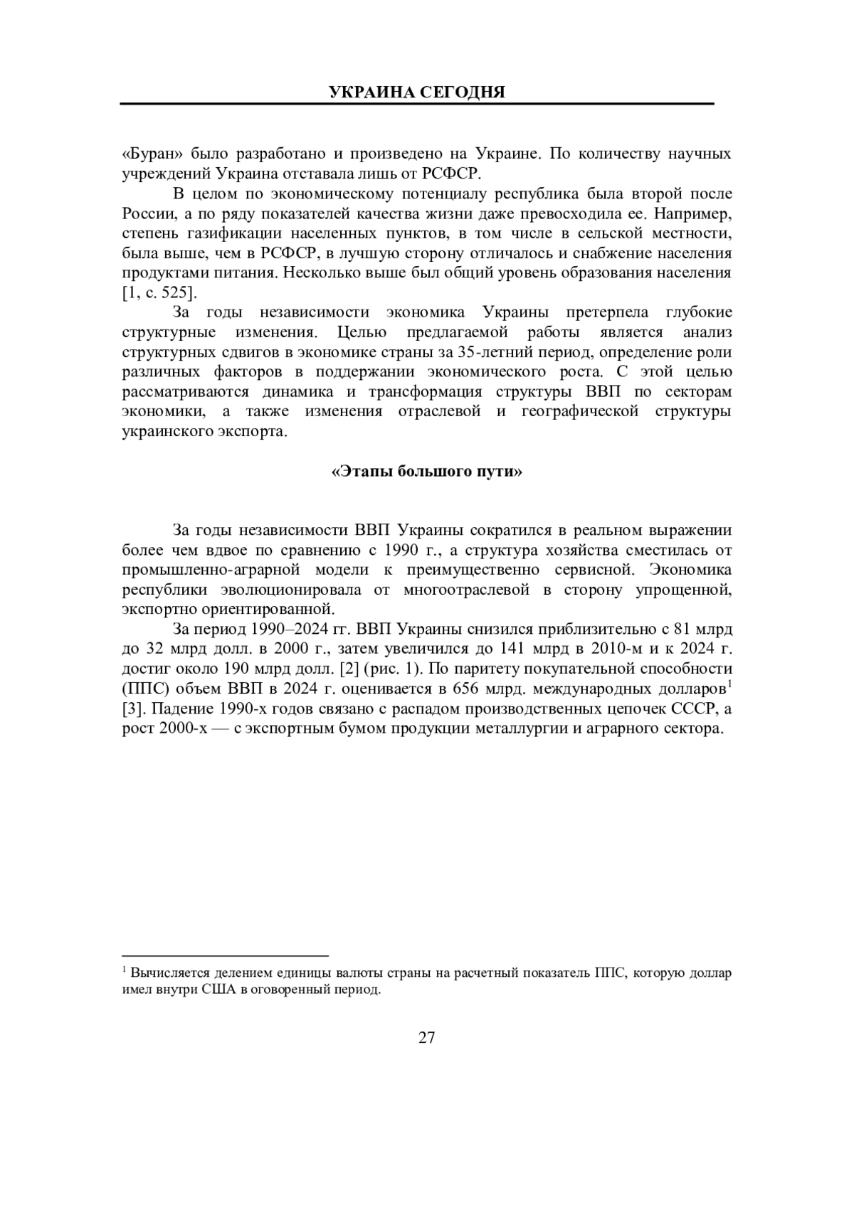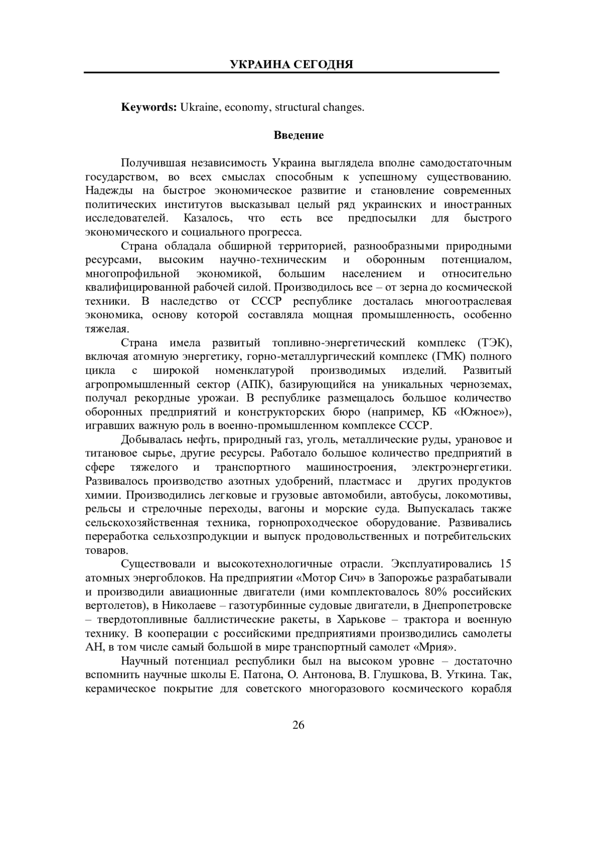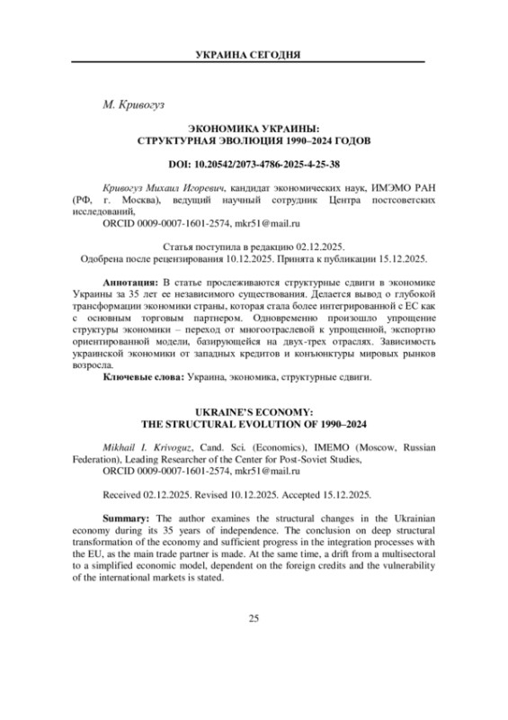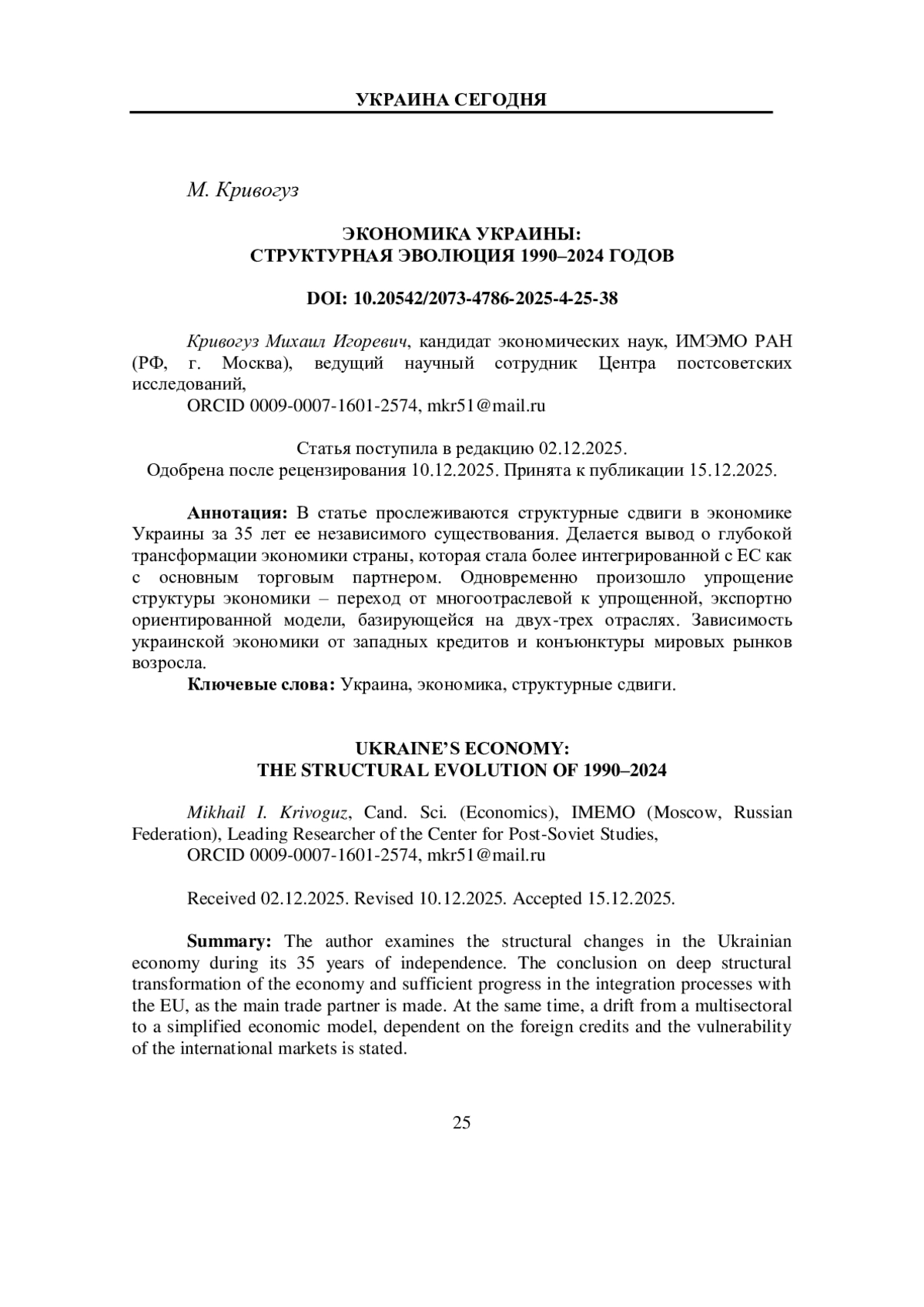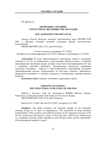 В статье прослеживаются структурные сдвиги в экономике Украины за 35 лет ее независимого существования. Делается вывод о глубокой трансформации экономики страны, которая стала более интегрированной с ЕС как с основным торговым партнером. Одновременно произошло упрощение структуры экономики – переход от многоотраслевой к упрощенной, экспортно ориентированной модели, базирующейся на двух-трех отраслях. Зависимость украинской экономики от западных кредитов и конъюнктуры мировых рынков возросла.