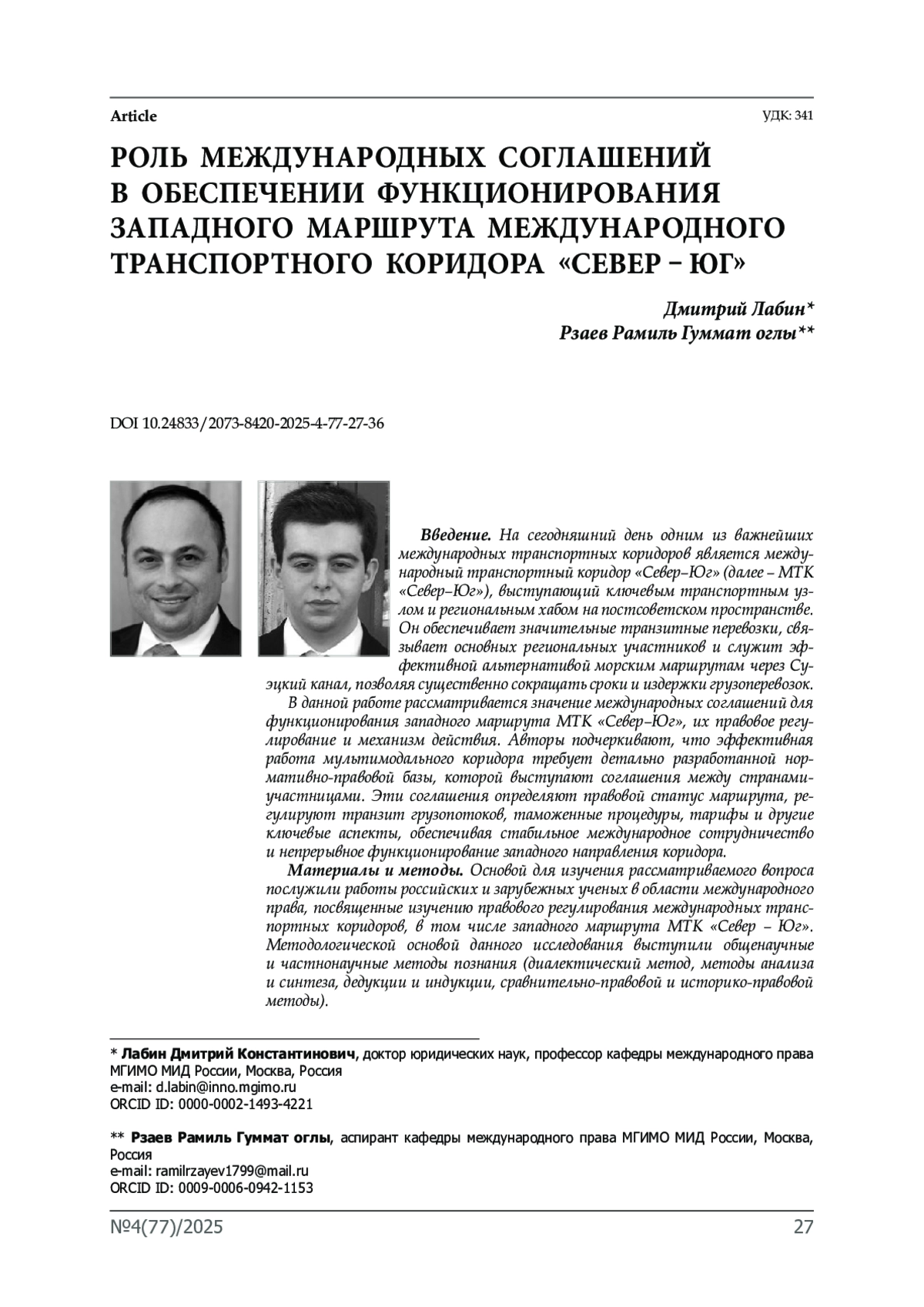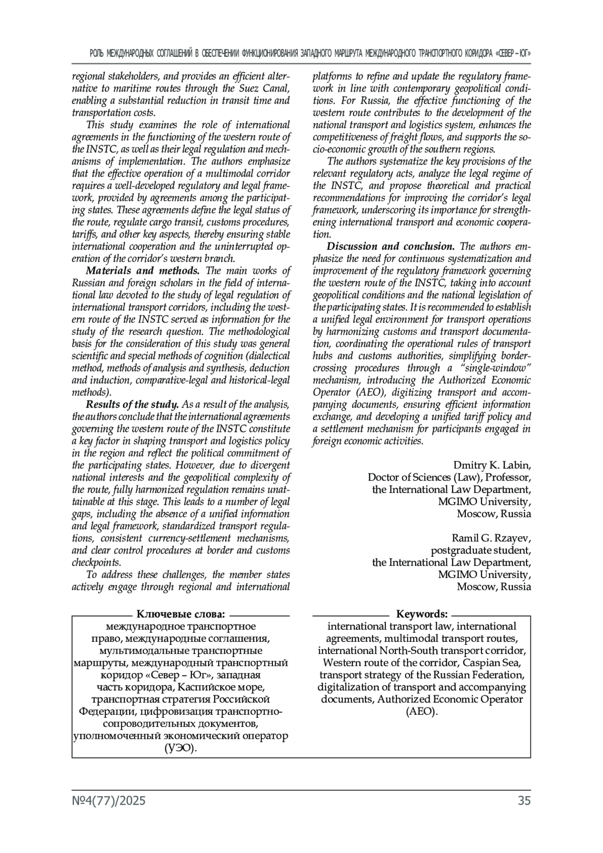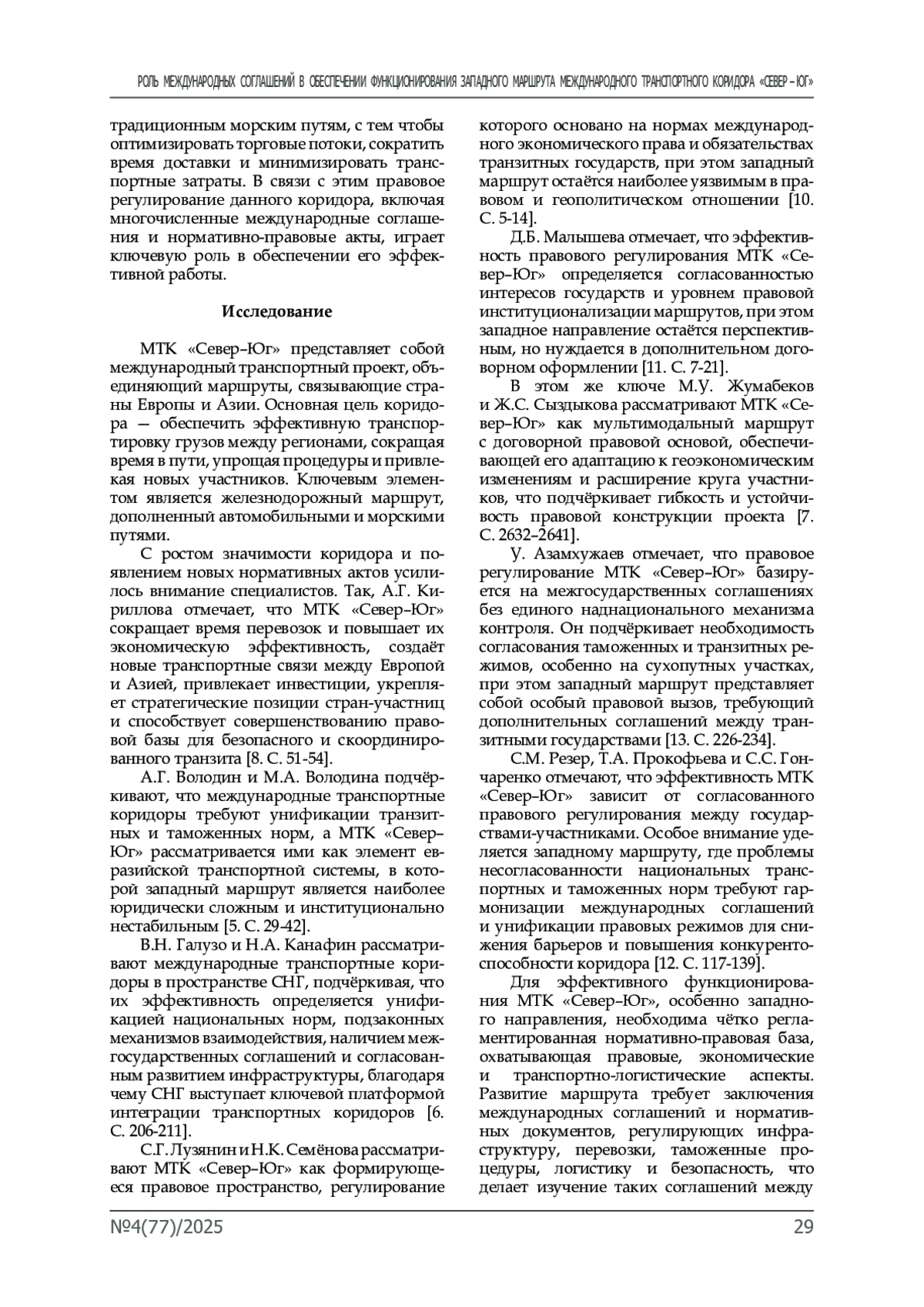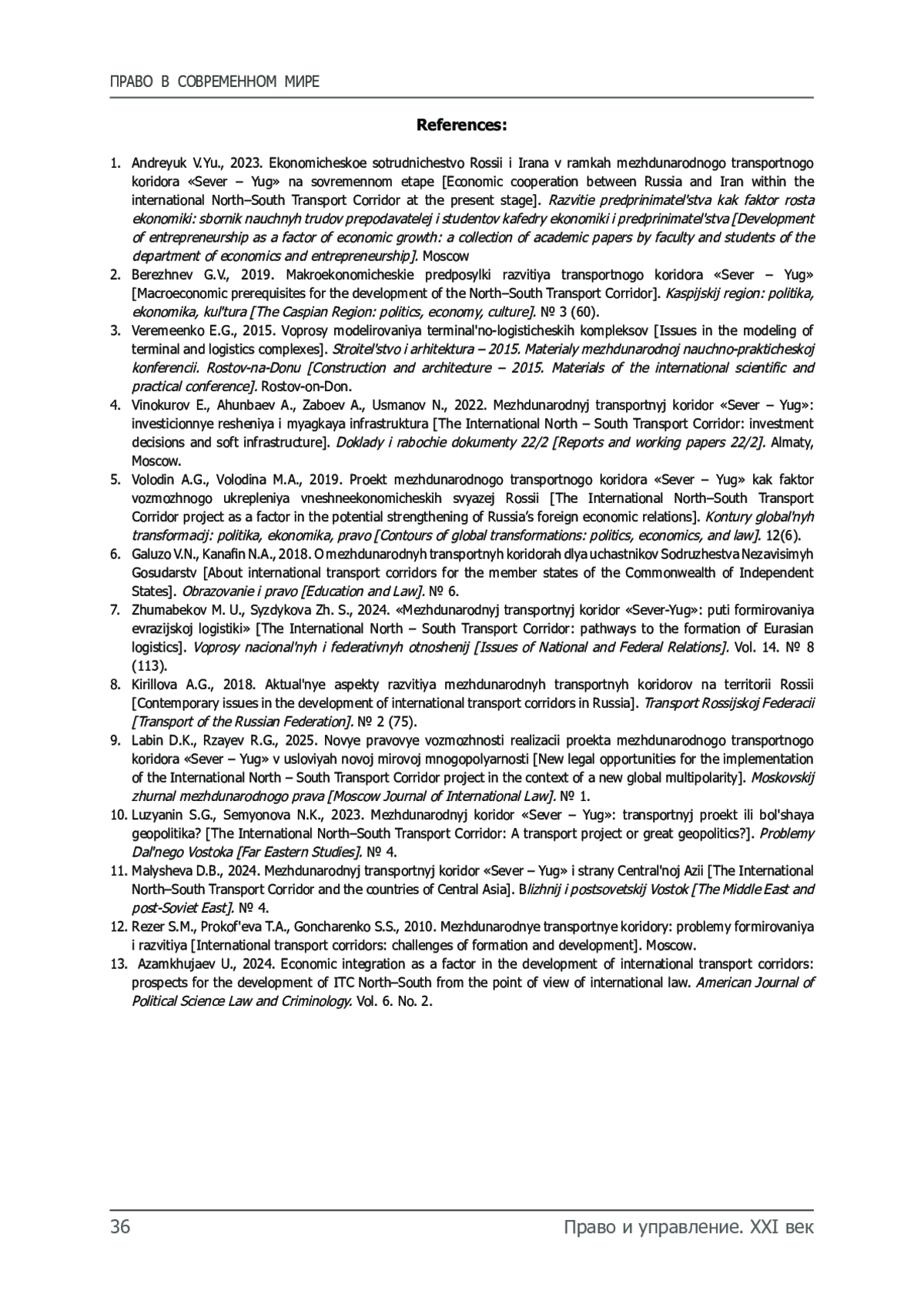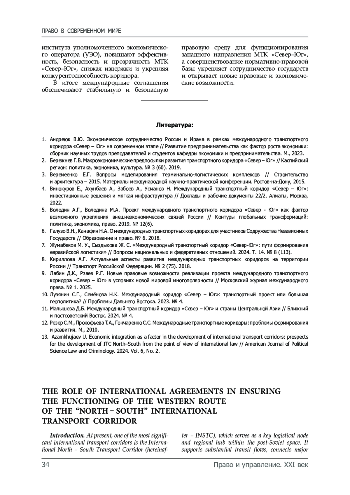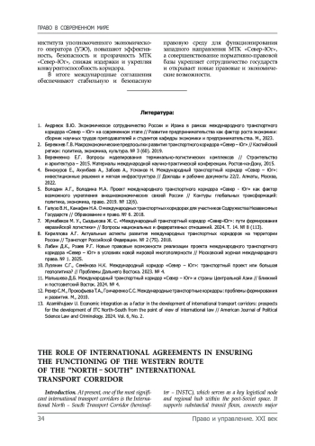 9. Лабин Д.К., Рзаев Р.Г. Новые правовые возможности реализации проекта международного транспортного коридора «Север - Юг» в условиях новой мировой многополярности // Московский журнал международного права. № 1. 2025.