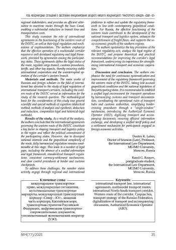 Введение. На сегодняшний день одним из важнейших международных транспортных коридоров является международный транспортный коридор «Север–Юг» (далее – МТК «Север–Юг»), выступающий ключевым транспортным узлом и региональным хабом на постсоветском пространстве. Он обеспечивает значительные транзитные перевозки, связывает основных региональных участников и служит эффективной альтернативой морским маршрутам через Суэцкий канал, позволяя существенно сокращать сроки и издержки грузоперевозок. В данной работе рассматривается значение международных соглашений для функционирования западного маршрута МТК «Север–Юг», их правовое регулирование и механизм действия. Авторы подчеркивают, что эффективная работа мультимодального коридора требует детально разработанной нормативно-правовой базы, которой выступают соглашения между странами- участницами. Эти соглашения определяют правовой статус маршрута, регулируют транзит грузопотоков, таможенные процедуры, тарифы и другие ключевые аспекты, обеспечивая стабильное международное сотрудничество и непрерывное функционирование западного направления коридора.