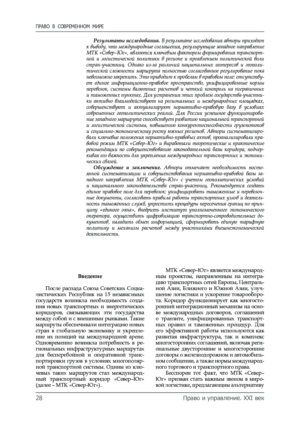Обсуждение и заключение. Авторы отмечают необходимость постоянной систематизации и совершенствования нормативно-правовой базы западного направления МТК «Север–Юг» с учетом геополитических условий и национального законодательства стран-участниц. Рекомендуется создать единое правовое поле для перевозок: унифицировать таможенные и перевозочные документы, согласовать правила работы транспортных узлов и деятельность таможенных служб, упростить процедуры пересечения границ по принципу «единого окна», внедрить институт уполномоченного экономического оператора, осуществить цифровизацию транспортно-сопроводительных документов, наладить обмен информацией, сформировать единую тарифную политику и механизм расчетов между участниками внешнеэкономической деятельности.