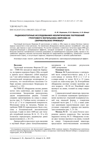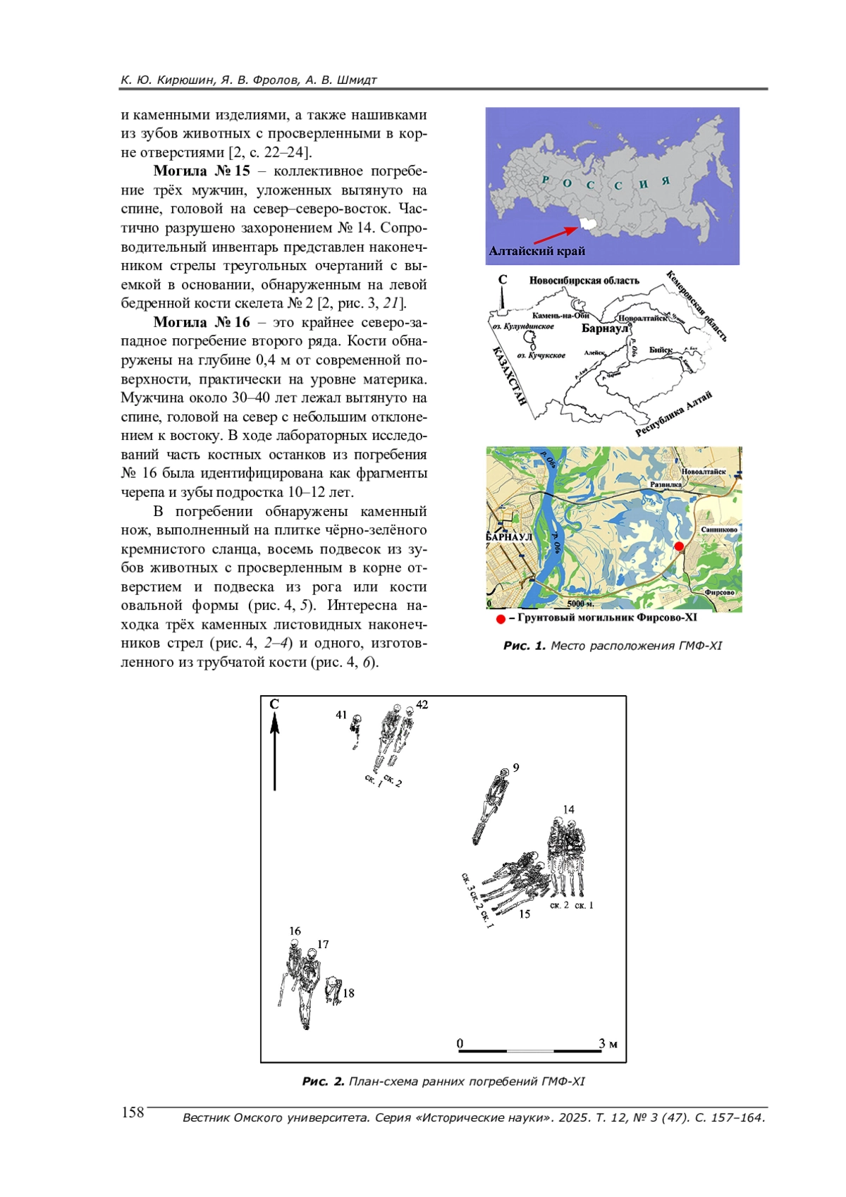 2. Кирюшин К. Ю., Кирюшин Ю. Ф., Солодовников К. Н., Фролов Я. В., Шапетько Е. В., Шмидт А. В. К вопросу об относительной и абсолютной хронологии ранних погребений грунтового могильника Фирсово-XI (Барнаульское Приобье) // Вестник археологии, антропологии и этнографии. - 2021. - № 3 (54). - С. 20-33. -. DOI: 10.20874/2071-0437-2021-54-3-2 EDN: ZUCDHG