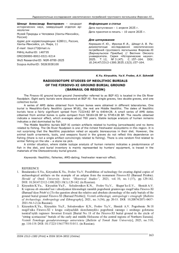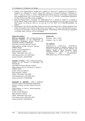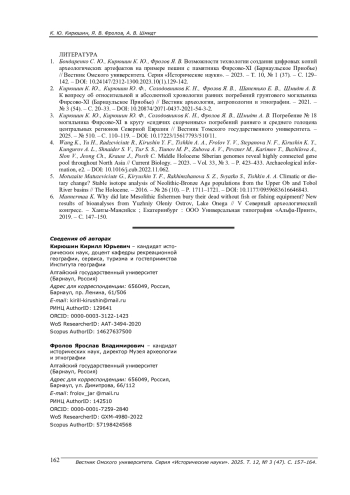 3. Кирюшин К. Ю., Кирюшин Ю. Ф., Солодовников К. Н., Фролов Я. В., Шмидт А. В. Погребение № 18 могильника Фирсово-XI в кругу “сидячих скорченных” погребений раннего и среднего голоцена центральных регионов Северной Евразии // Вестник Томского государственного университета. - 2025. - № 510. - С. 110-119. -. DOI: 10.17223/15617793/510/11 EDN: VZGNUO