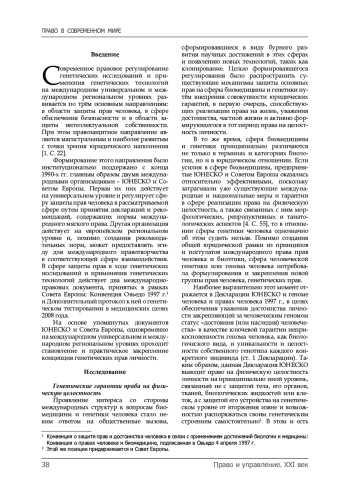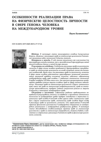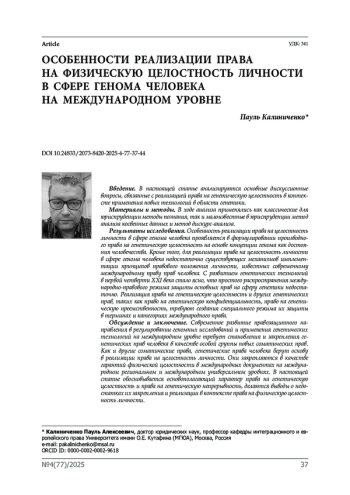 Введение. В настоящей статье анализируются основные дискуссионные вопросы, связанные с реализацией права на генетическую целостность в контексте применения новых технологий в области генетики.