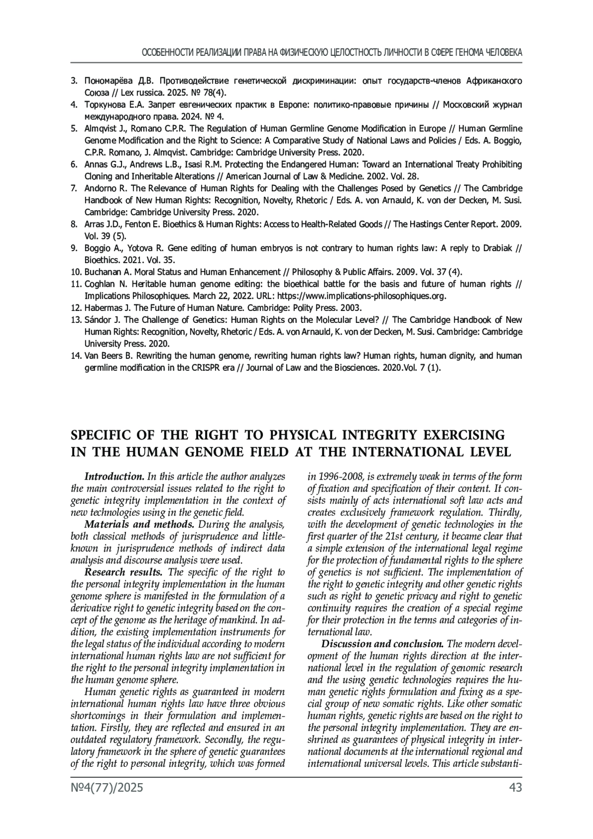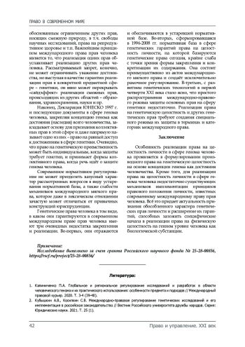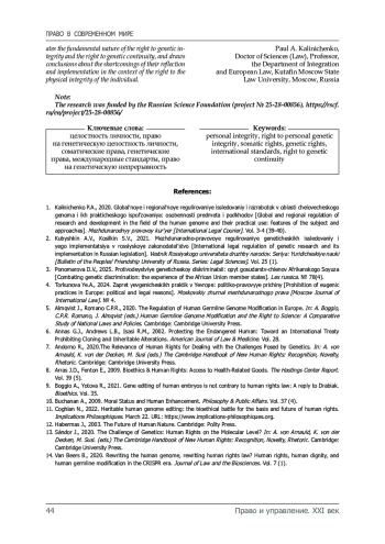 1. Калиниченко П.А. Глобальное и региональное регулирование исследований и разработок в области человеческого генома и их практического использования: особенности предмета и подходов // Международный правовой курьер. 2020. Т. 3-4 (39-40).