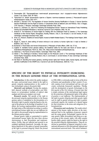 2. Кубышкин А.В., Косилкин С.В. Международно-правовое регулирование генетических исследований и его имплементация в российское законодательство // Вестник Российского университета дружбы народов. Серия: Юридические науки. 2021. Т. 25 (1).