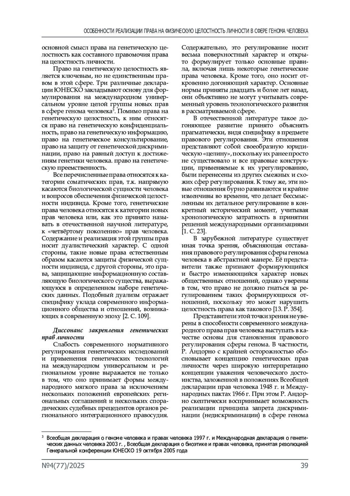 Обсуждение и заключение. Современное развитие правозащитного направления в регулировании геномных исследований и применения генетических технологий на международном уровне требует становления и закрепления генетических прав человека в качестве особой группы новых соматических прав. Как и другие соматические права, генетические права человека берут основу в реализации права на целостность личности. Они закрепляются в качестве гарантий физической целостности в международных документах на международном региональном и международном универсальном уровнях. В настоящей статье обосновывается основополагающий характер права на генетическую целостность и права на генетическую непрерывность, делаются выводы о недостатках их закрепления и реализации в контексте права на физическую целостность личности.