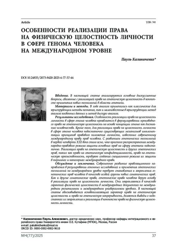 Результаты исследования. Особенность реализации права на целостность личности в сфере генома человека проявляется в формулировании производного права на генетическую целостность на основе концепции генома как достояния человечества. Кроме того, для реализации права на целостность личности в сфере генома человека недостаточно существующих механизмов имплементации принципов правового положения личности, известных современному международному праву прав человека. C развитием генетических технологий в первой четверти XXI века стало ясно, что простого распространения международно-правового режима защиты основных прав на сферу генетики недостаточно. Реализация права на генетическую целостность и других генетических прав, таких как право на генетическую конфиденциальность, право на генетическую преемственность, требуют создания специального режима их защиты в терминах и категориях международного права.