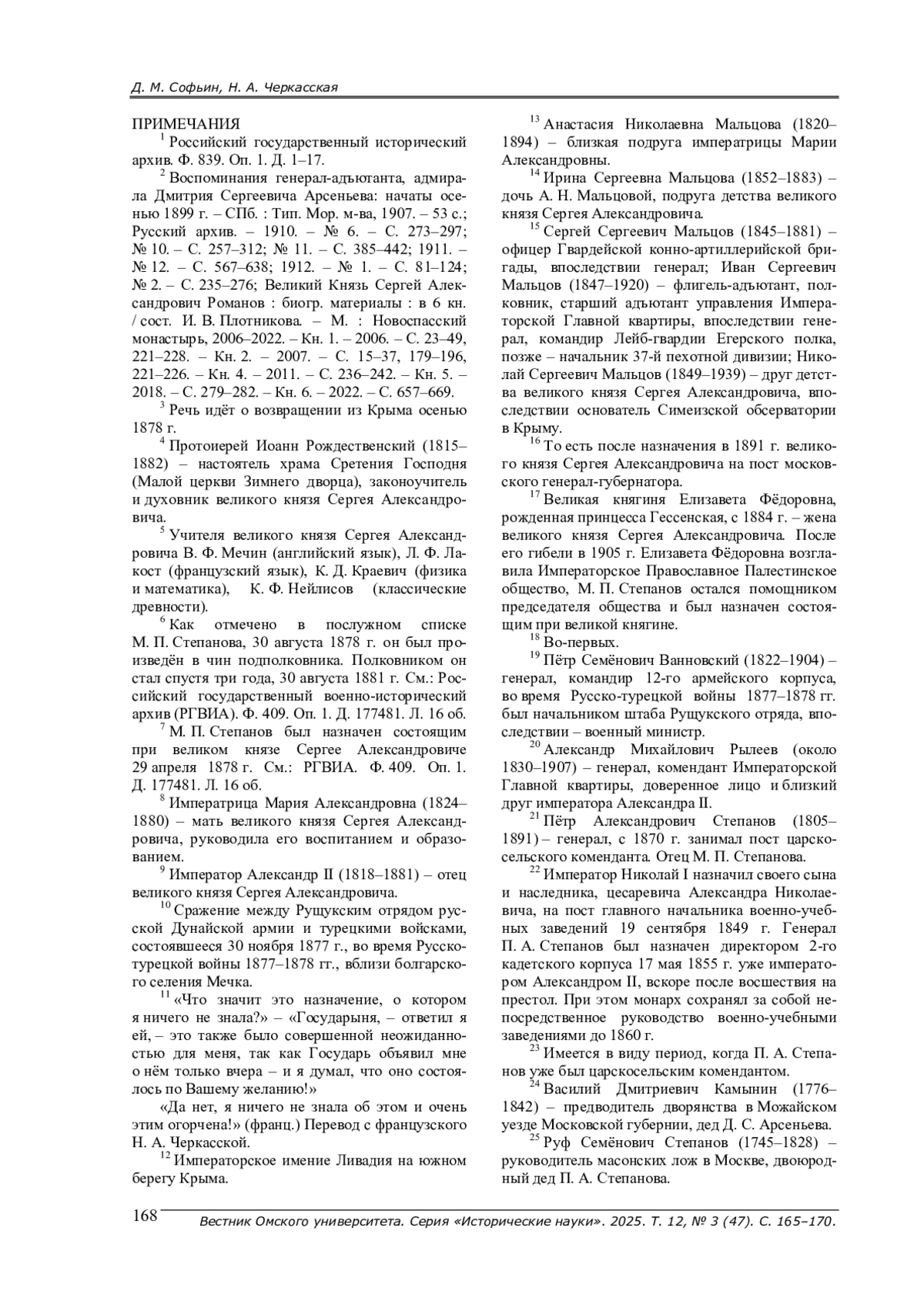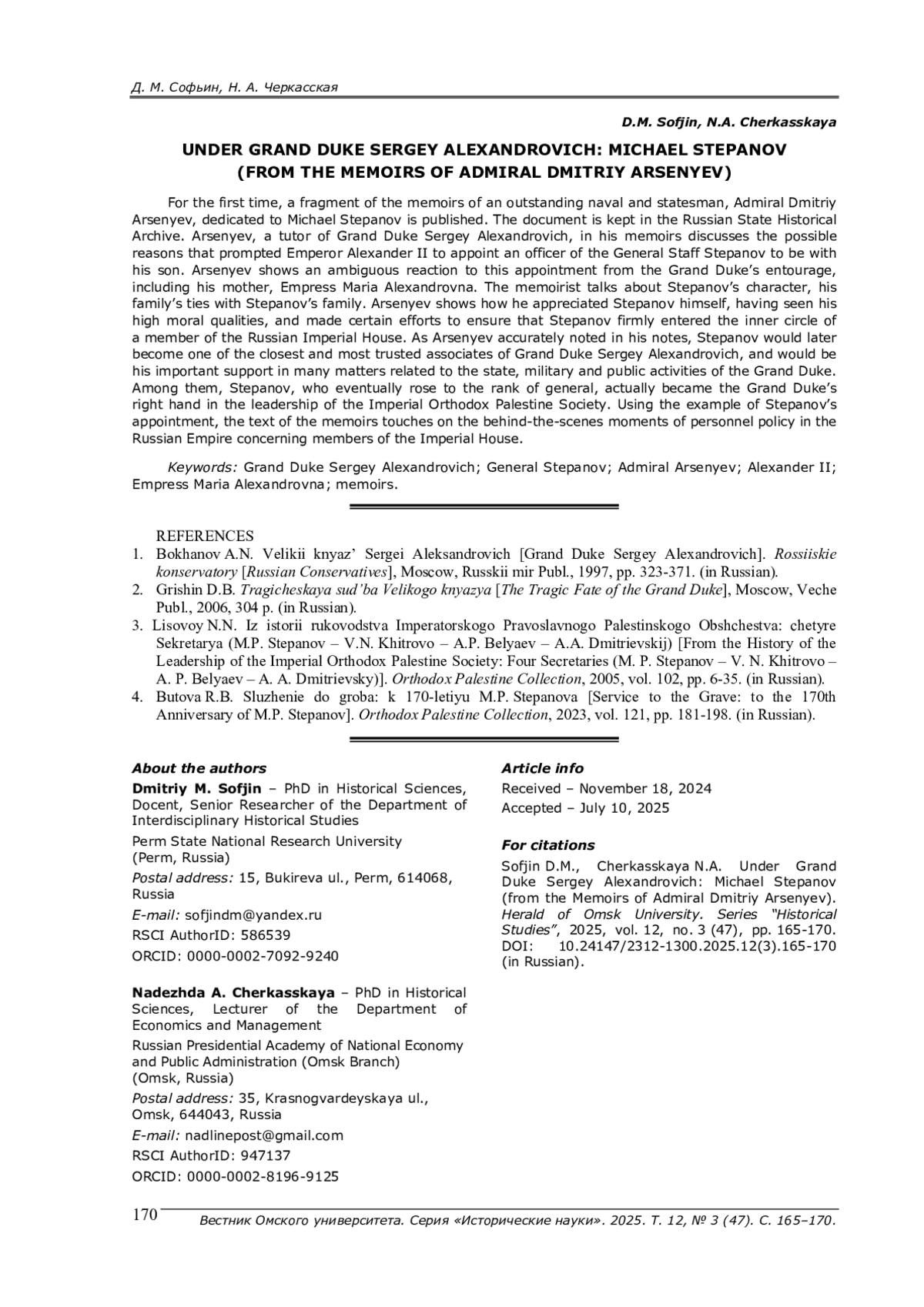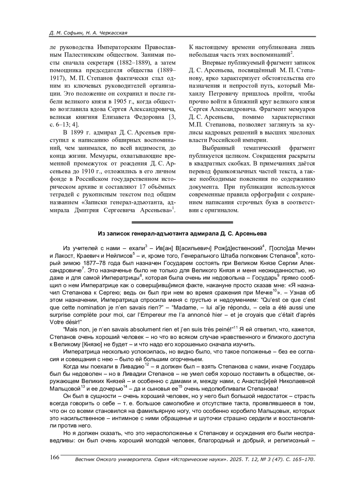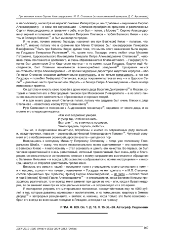 Впервые публикуется фрагмент воспоминаний Д. С. Арсеньева, посвященный М. П. Степанову. Адмирал Д. С. Арсеньев, воспитатель и попечитель великого князя Сергея Александровича, в своих мемуарах показывает, как происходило вхождение офицера Генерального штаба М. П. Степанова в ближний круг члена Дома Романовых. На примере назначения М. П. Степанова в тексте мемуаров показываются закулисные моменты кадровой политики в Российской империи, касающиеся членов царствующей династии.