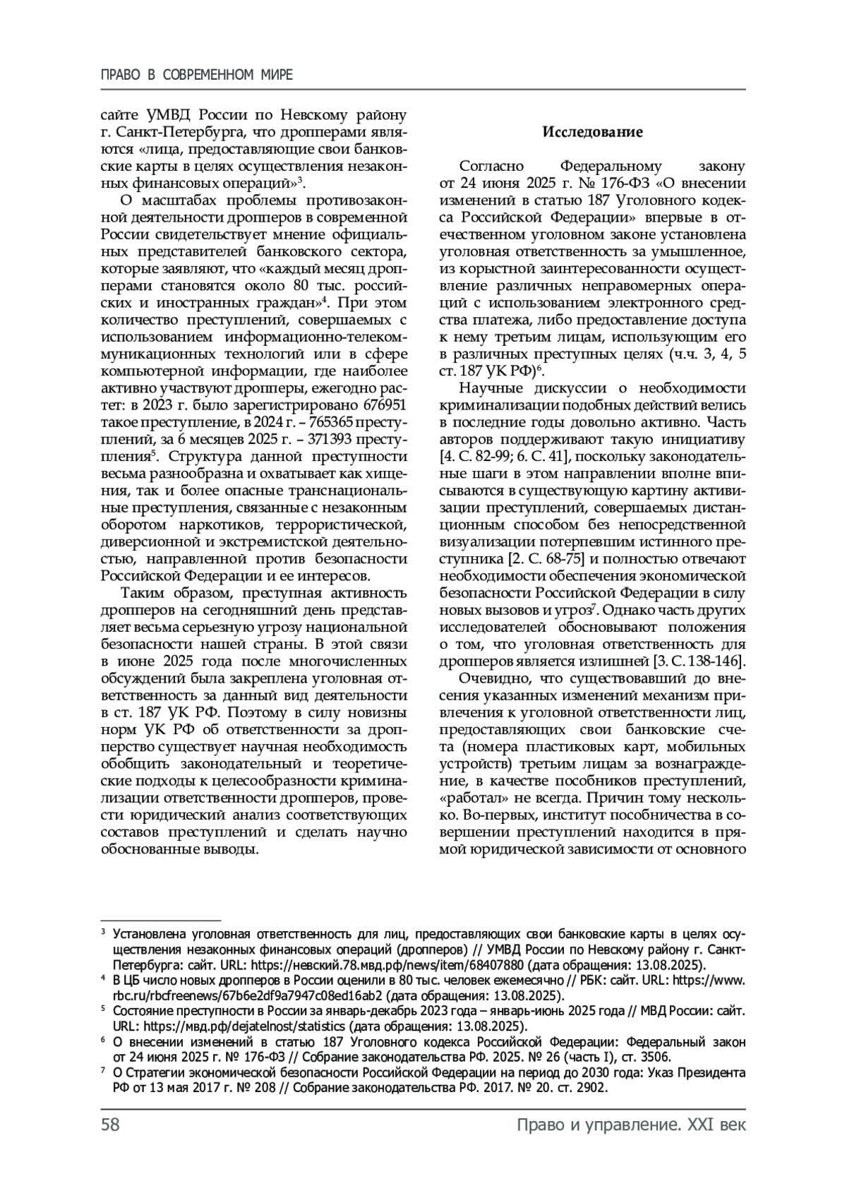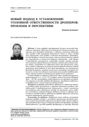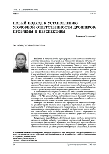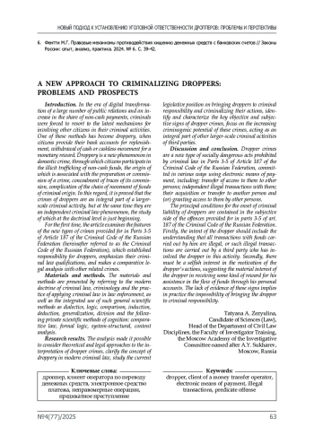 Введение. В эпоху цифровой трансформации большого количества общественных отношений, увеличения доли безналичного денежного расчета, преступники были вынуждены прибегнуть к новейшим механизмам вовлечения иных граждан в свою преступную деятельность. Одним из таких способов стало дропперство, когда граждане за денежное вознаграждение предоставляют свои банковские счета для пополнения, снятия наличных денежных средств или осуществления их безналичного движения. Дропперство – новое явление в отечественной преступности, посредствам которого граждане участвуют в незаконном обороте безналичных денежных средств, происхождение которых связано с подготовкой или совершением какого-либо преступления, сокрытием следов его совершения, усложнением цепочки движения денежных средств преступного происхождения. В этой связи доказывается, что преступления дропперов выступают составной частью более масштабной преступной деятельности, но при этом являются самостоятельным уголовно-правовым феноменом, изучение которого на доктринальном уровне только начинается. В статье впервые исследуются особенности новых составов преступлений, предусмотренных в ч. ч. 3-5 ст. 187 Уголовного кодекса Российской Федерации (далее – УК РФ), установившие ответственность для дропперов, расставляются акценты их уголовно-правовой квалификации, производится сравнительно-правовой анализ с иными смежными преступлениями.
