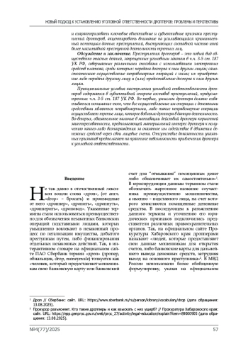 Результаты исследования. Проведенный анализ позволил рассмотреть теоретико-правовые подходы к толкованию преступлений дропперов, уточнить понятие дропперства в современном уголовном праве, изучить современную законодательную позицию по вопросам привлечения дропперов к уголовной ответственности и уголовно-правовой квалификации их действий, выделить и охарактеризовать ключевые объективные и субъективные признаки преступлений дропперов, акцентировать внимание на усиливающийся криминогенный потенциал данных преступлений, выступающих составной частью иной более масштабной преступной деятельности третьих лиц.