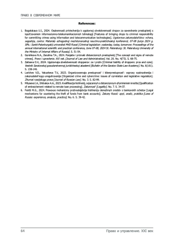 2. Горшкова Н.А., Зезюлина Т.А. Понятие и признаки дистанционных преступлений // Право и управление. XXI век. 2024. Т. 20, № 4(73). С. 68-75.