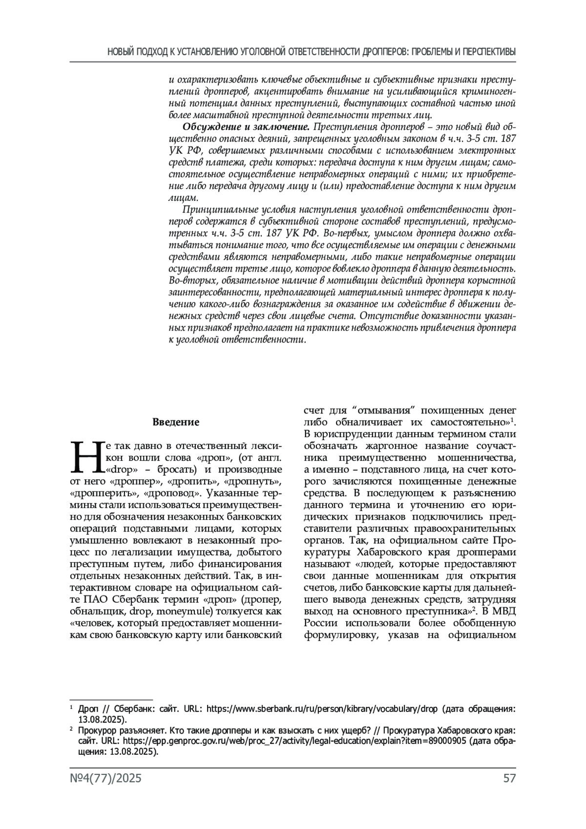 Обсуждение и заключение. Преступления дропперов – это новый вид общественно опасных деяний, запрещенных уголовным законом в ч. ч. 3-5 ст. 187 УК РФ, совершаемых различными способами с использованием электронных средств платежа, среди которых: передача доступа к ним другим лицам; самостоятельное осуществление неправомерных операций с ними; их приобретение либо передача другому лицу и (или) предоставление доступа к ним другим лицам. Принципиальные условия наступления уголовной ответственности дропперов содержатся в субъективной стороне составов преступлений, предусмотренных ч. ч. 3-5 ст. 187 УК РФ. Во-первых, умыслом дроппера должно охватываться понимание того, что все осуществляемые им операции с денежными средствами являются неправомерными, либо такие неправомерные операции осуществляет третье лицо, которое вовлекло дроппера в данную деятельность. Во-вторых, обязательное наличие в мотивации действий дроппера корыстной заинтересованности, предполагающей материальный интерес дроппера к получению какого-либо вознаграждения за оказанное им содействие в движении денежных средств через свои лицевые счета. Отсутствие доказанности указаннных признаков предполагает на практике невозможность привлечения дроппера к уголовной ответственности.