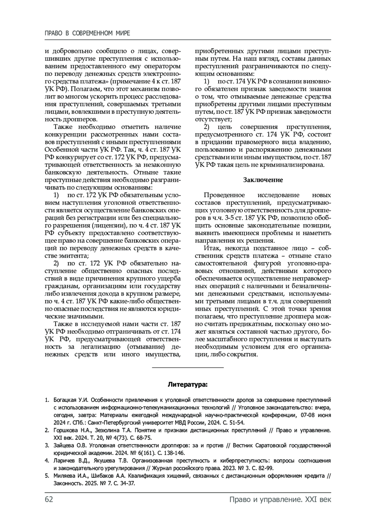 4. Ларичев В.Д., Якушева Т.В. Организованная преступность и киберпреступность: вопросы соотношения и законодательного урегулирования // Журнал российского права. 2023. № 3. С. 82-99.