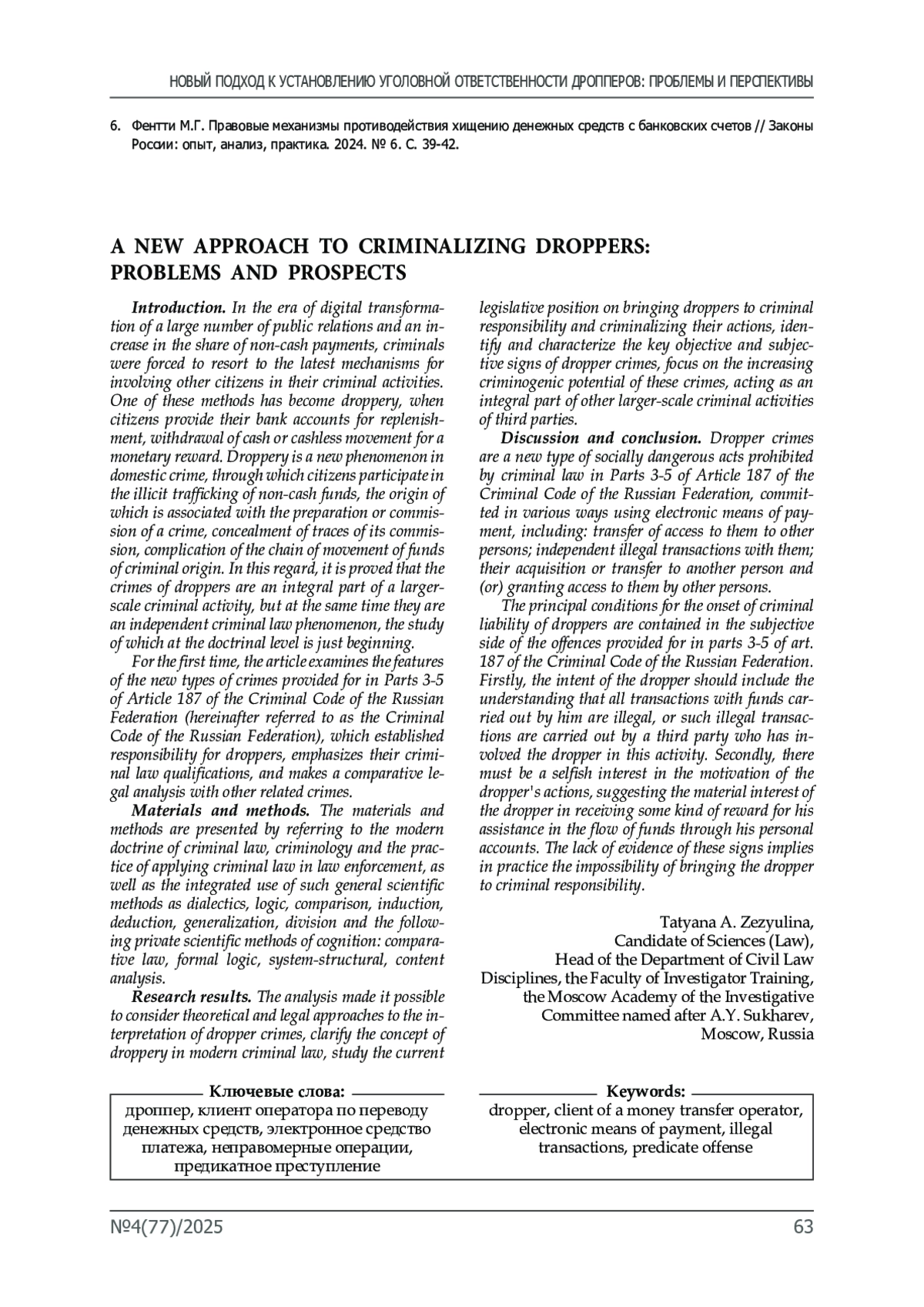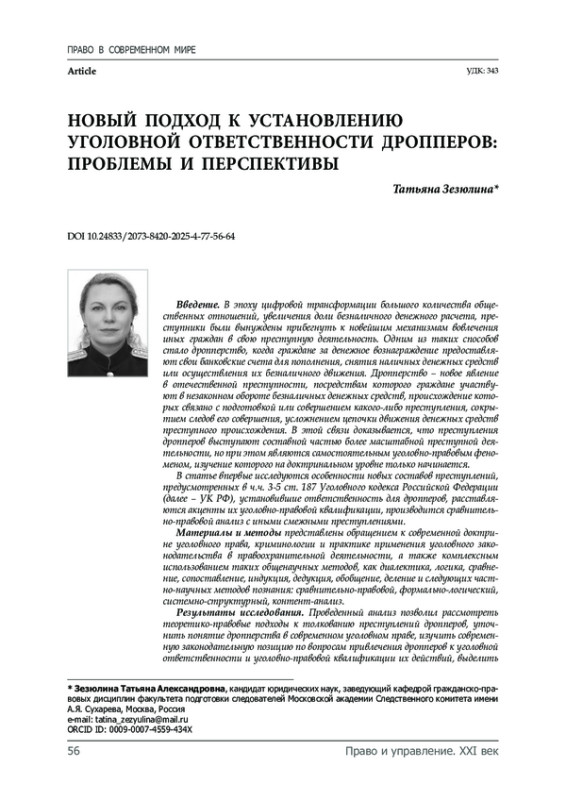 3. Зайцева О.В. Уголовная ответственности дропперов: за и против // Вестник Саратовской государственной юридической академии. 2024. № 6(161). С. 138-146.