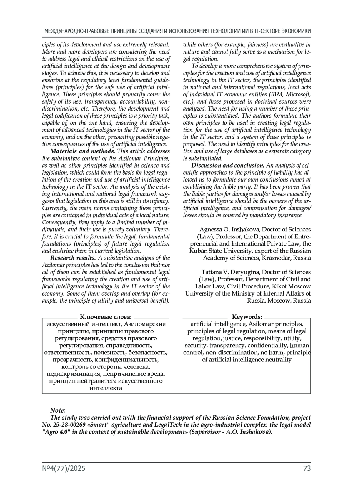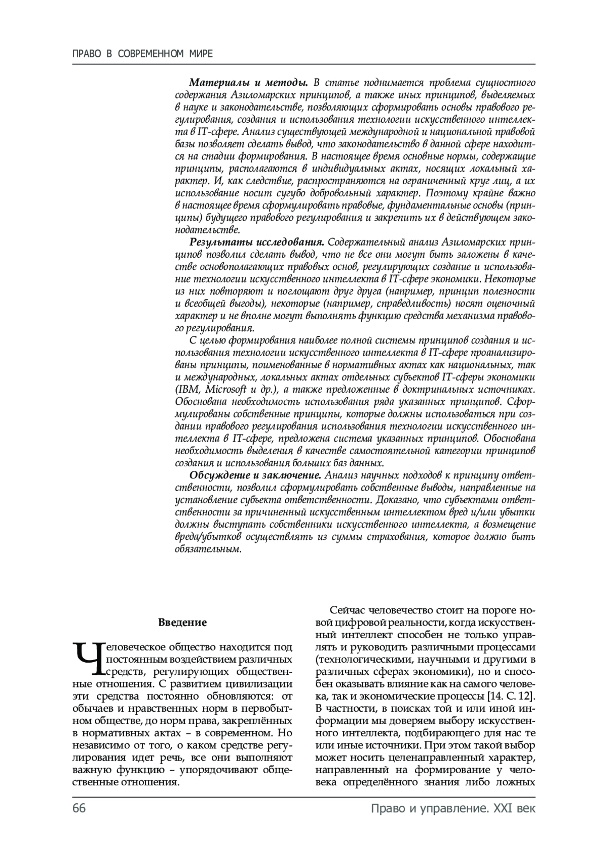 Материалы и методы. В статье поднимается проблема сущностного содержания Азиломарских принципов, а также иных принципов, выделяемых в науке и законодательстве, позволяющих сформировать основы правового регулирования, создания и использования технологии искусственного интеллекта в IT-сфере. Анализ существующей международной и национальной правовой базы позволяет сделать вывод, что законодательство в данной сфере находится на стадии формирования. В настоящее время основные нормы, содержащие принципы, располагаются в индивидуальных актах, носящих локальный характер. И, как следствие, распространяются на ограниченный круг лиц, а их использование носит сугубо добровольный характер. Поэтому крайне важно в настоящее время сформулировать правовые, фундаментальные основы (принципы) будущего правового регулирования и закрепить их в действующем законодательстве.