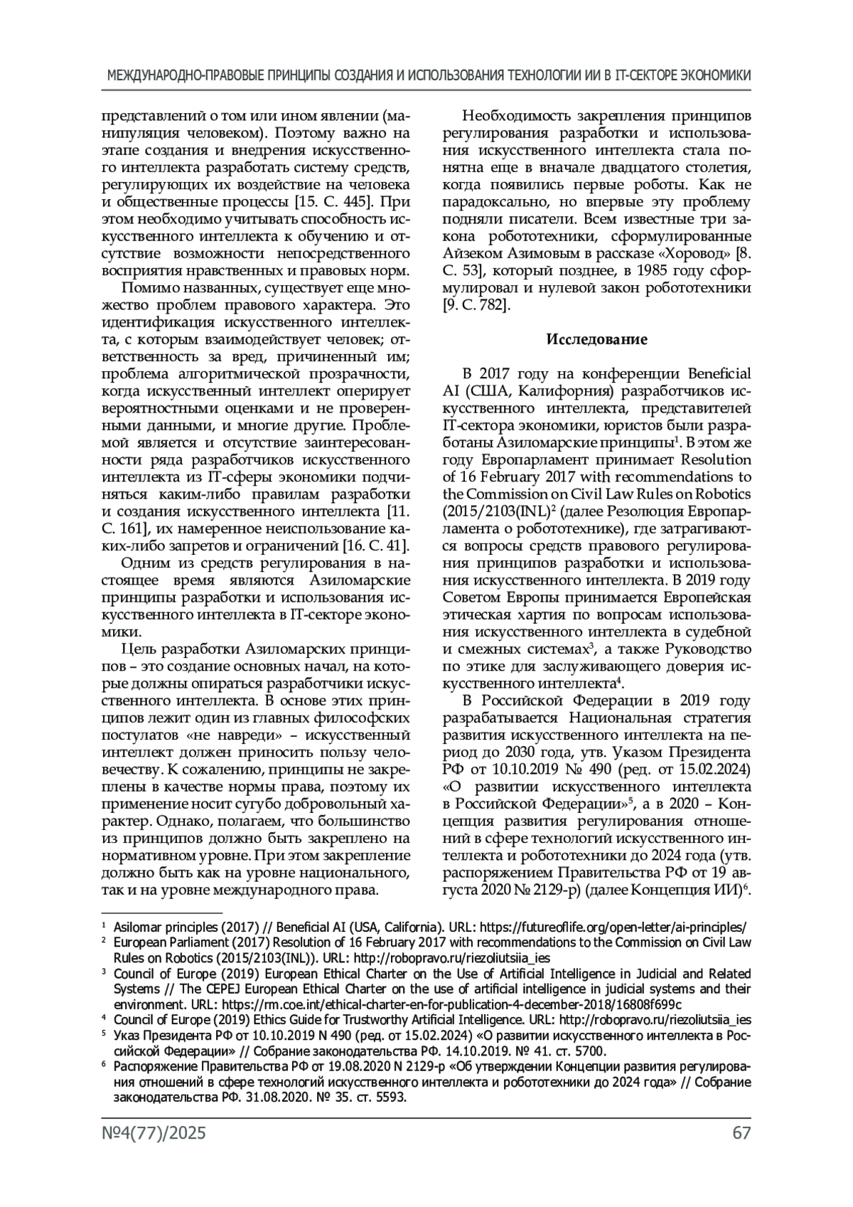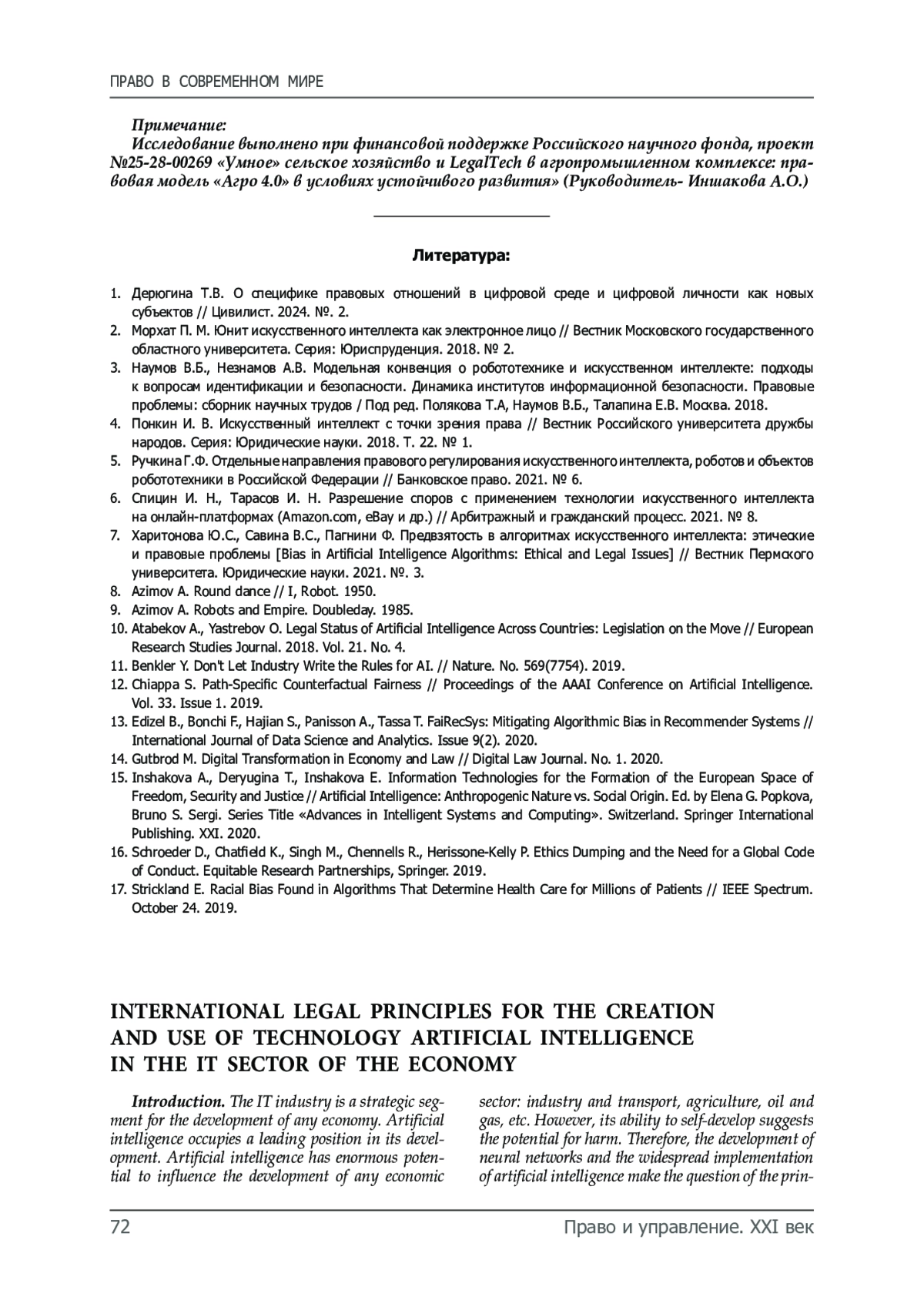 5. Ручкина Г.Ф. Отдельные направления правового регулирования искусственного интеллекта, роботов и объектов робототехники в Российской Федерации // Банковское право. 2021. № 6.