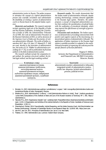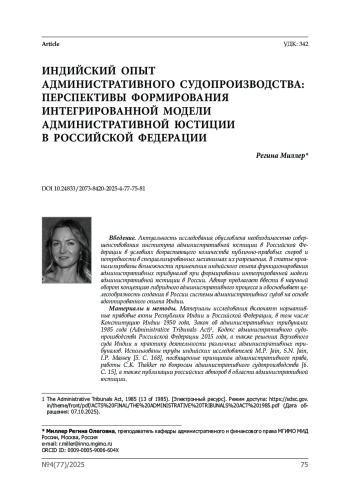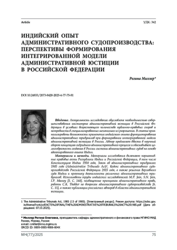 Введение. Актуальность исследования обусловлена необходимостью совершенствования института административной юстиции в Российской Федерации в условиях возрастающего количества публично-правовых споров и потребности в специализированных механизмах их разрешения. В статье проанализированы возможности применения индийского опыта функционирования административных трибуналов при формировании интегрированной модели административной юстиции в России. Автор предлагает ввести в научный оборот концепцию гибридного административного процесса и обосновывает целесообразность создания в России системы административных судов на основе адаптированного опыта Индии.