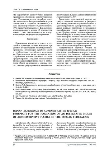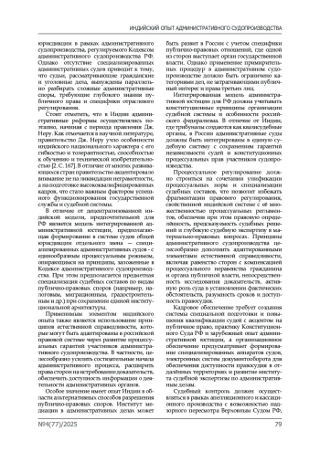 Обсуждение и заключение. Индийский опыт административного судопроизводства демонстрирует как позитивные, так и негативные аспекты функционирования децентрализованной системы административных трибуналов. Применение индийского опыта в российской правовой системе возможно при условии его адаптации к конституционным принципам организации судебной власти и особенностям российского федерализма.