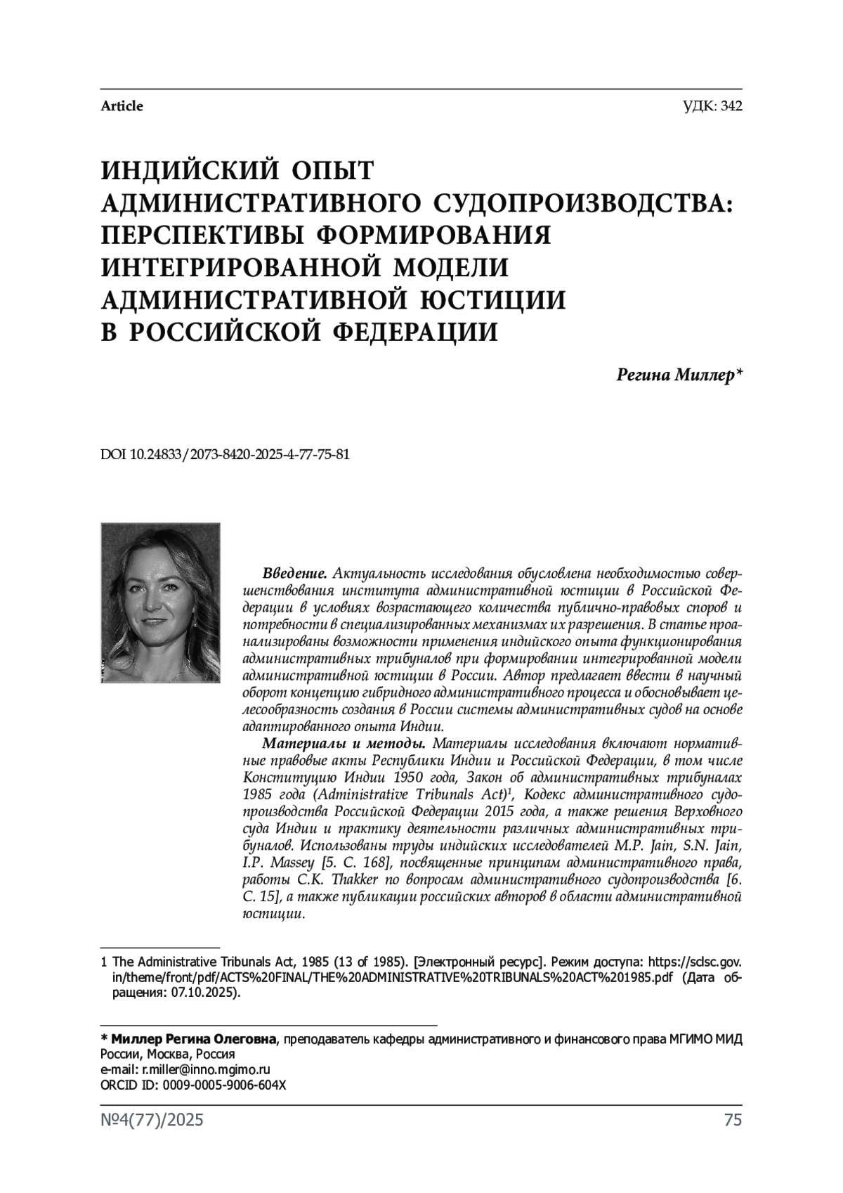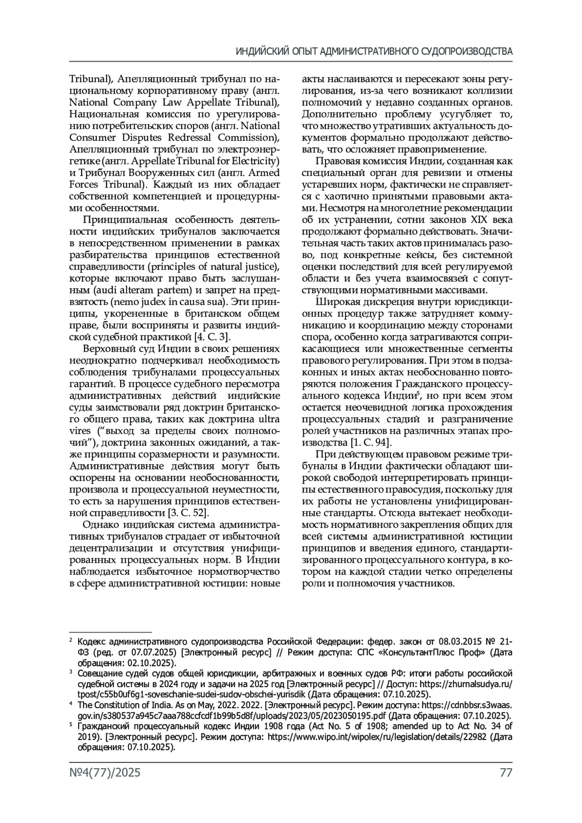 Материалы и методы. Материалы исследования включают нормативные правовые акты Республики Индии и Российской Федерации, в том числе Конституцию Индии 1950 года, Закон об административных трибуналах 1985 года (Administrative Tribunals Act)1, Кодекс административного судопроизводства Российской Федерации 2015 года, а также решения Верховного суда Индии и практику деятельности различных административных трибуналов. Использованы труды индийских исследователей M. P. Jain, S. N. Jain, I. P. Massey [5. C. 168], посвященные принципам административного права, работы C. K. Thakker по вопросам административного судопроизводства [6. C. 15], а также публикации российских авторов в области административной юстиции. Методами исследования являются сравнительно-правовой метод, системно-структурный метод, формально-юридический метод, а также метод правового моделирования.