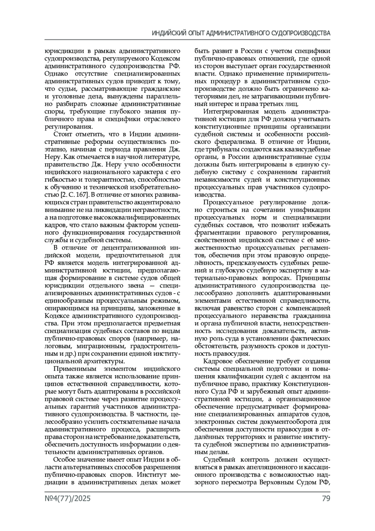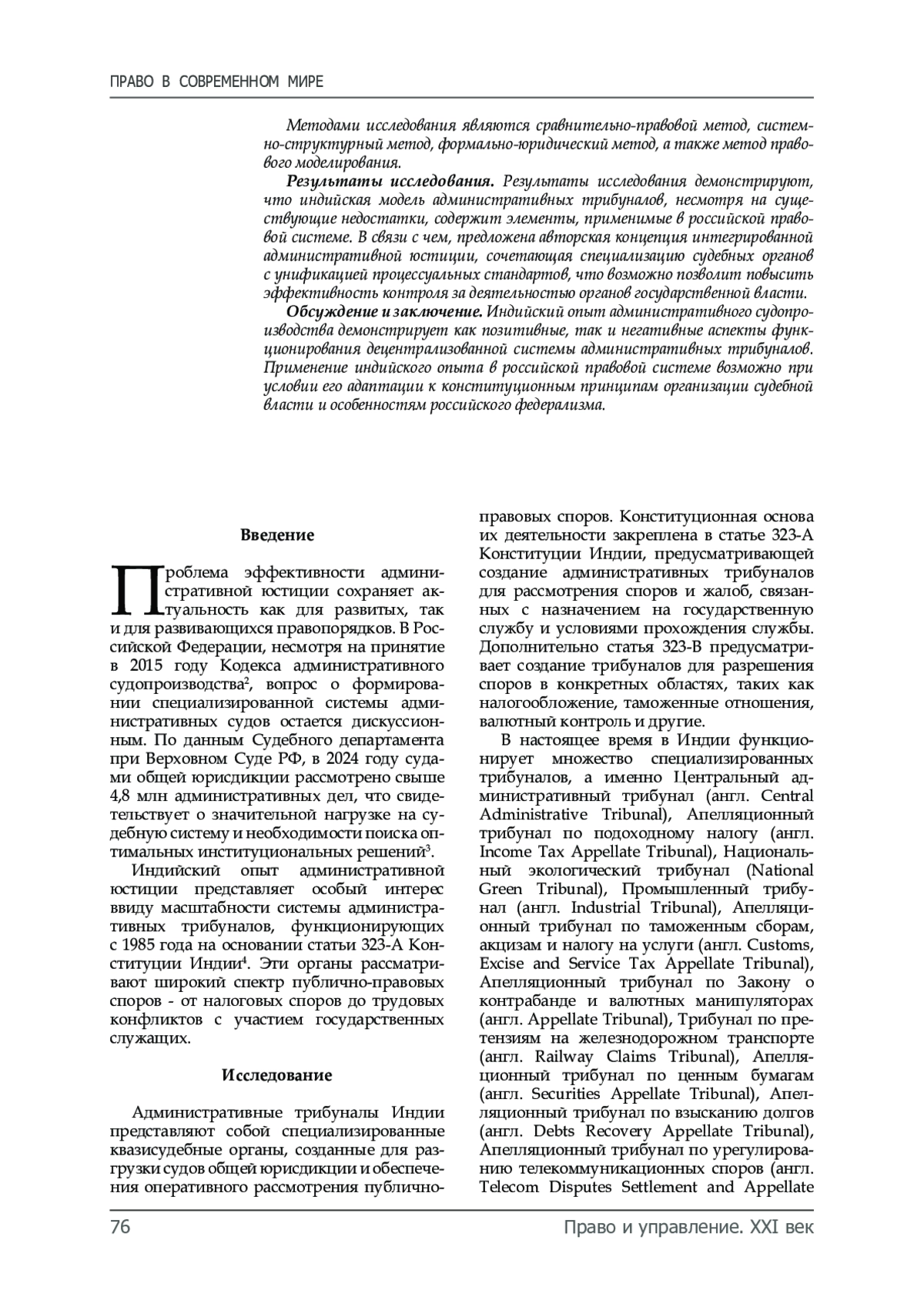 Результаты исследования. Результаты исследования демонстрируют, что индийская модель административных трибуналов, несмотря на существующие недостатки, содержит элементы, применимые в российской правовой системе. В связи с чем, предложена авторская концепция интегрированной административной юстиции, сочетающая специализацию судебных органов с унификацией процессуальных стандартов, что возможно позволит повысить эффективность контроля за деятельностью органов государственной власти.