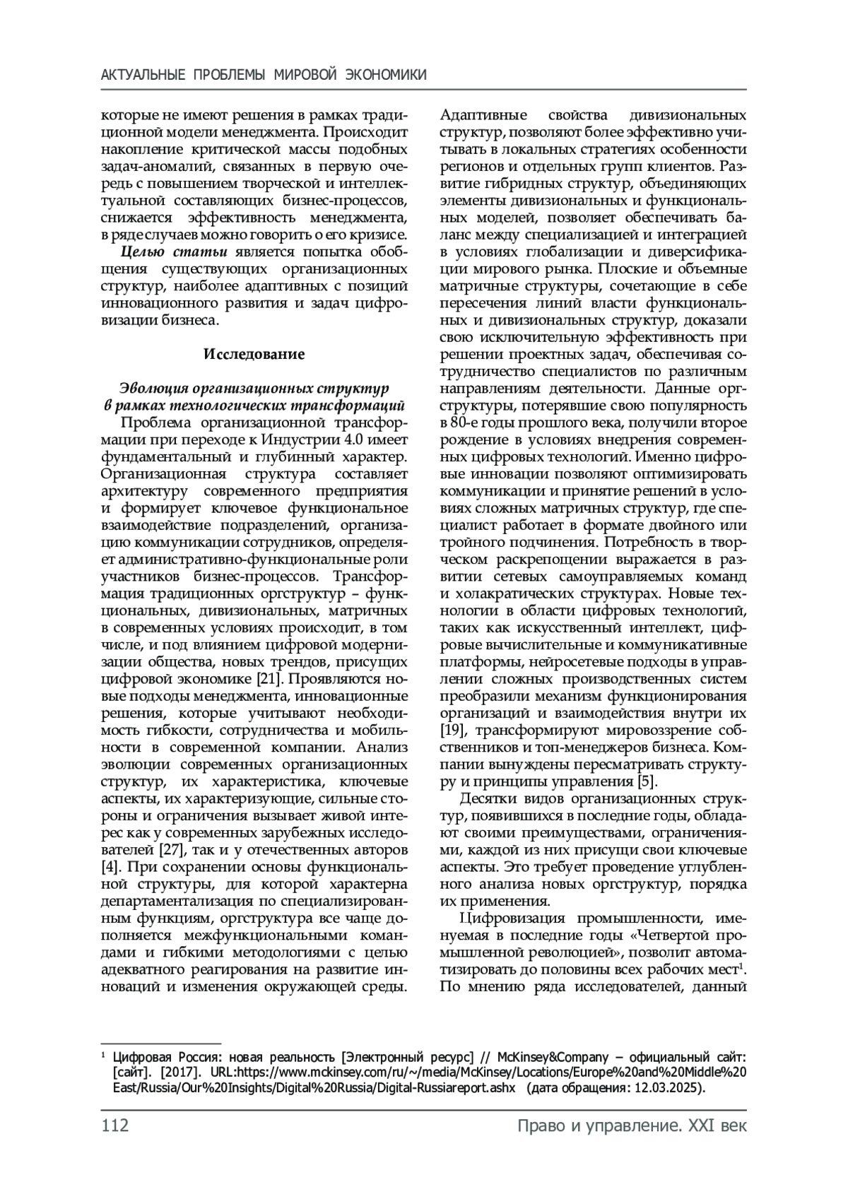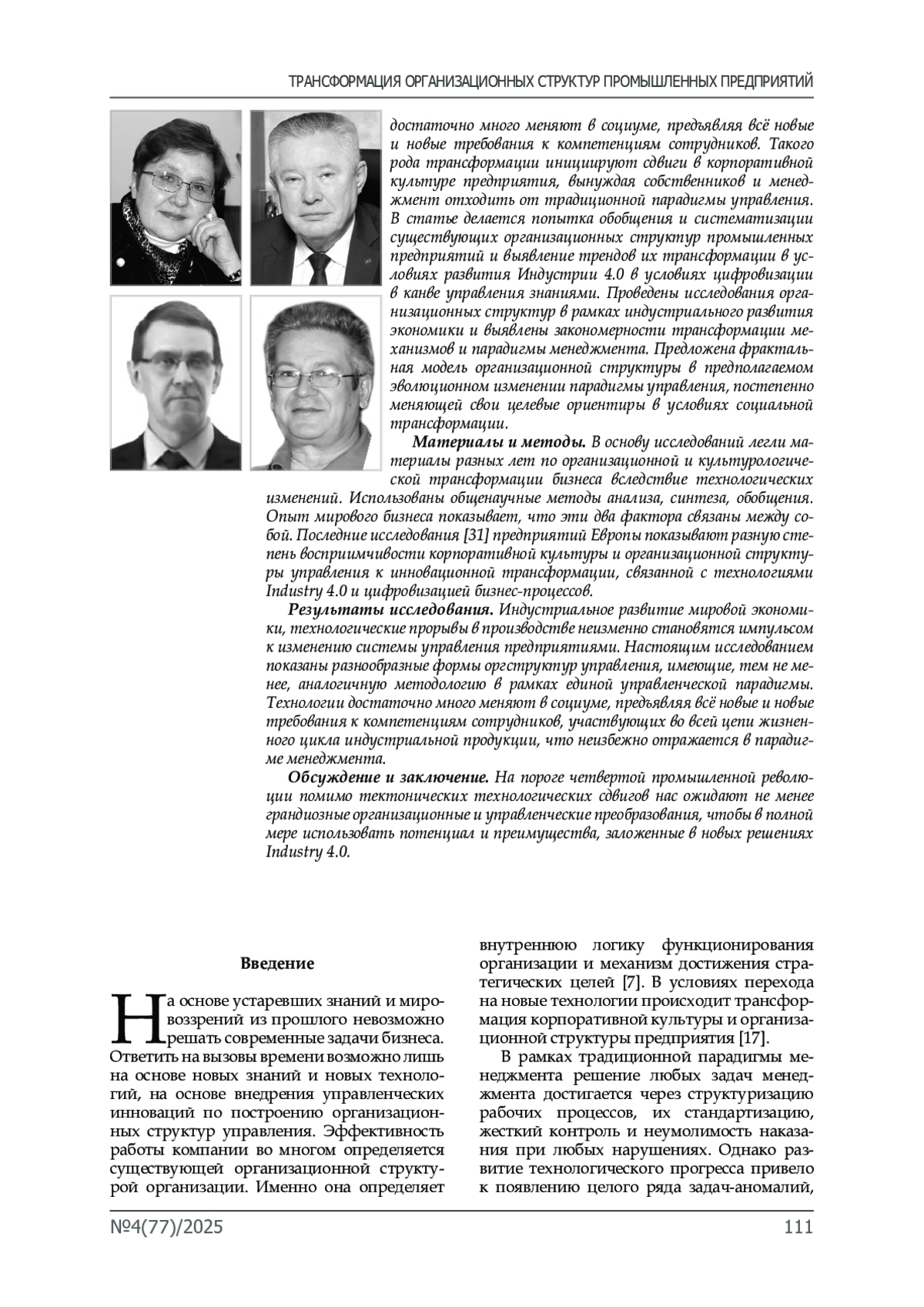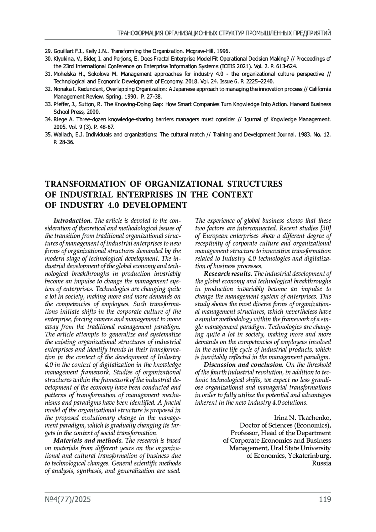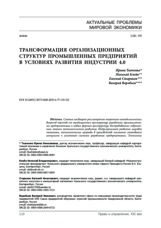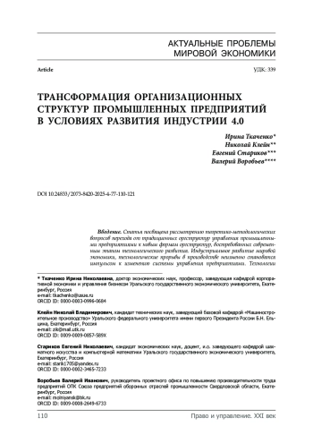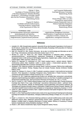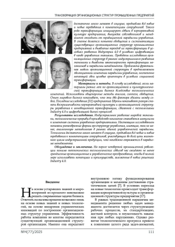 Введение. Статья посвящена рассмотрению теоретико-методологических вопросов перехода от традиционных оргструктур управления промышленными предприятиями к новым формам оргструктур, востребованных современным этапом технологического развития. Индустриальное развитие мировой экономики, технологические прорывы в производстве неизменно становятся импульсом к изменению системы управления предприятиями. Технологии достаточно много меняют в социуме, предъявляя всё новые и новые требования к компетенциям сотрудников. Такого рода трансформации инициируют сдвиги в корпоративной культуре предприятия, вынуждая собственников и менеджмент отходить от традиционной парадигмы управления. В статье делается попытка обобщения и систематизации существующих организационных структур промышленных предприятий и выявление трендов их трансформации в условиях развития Индустрии 4.0 в условиях цифровизации в канве управления знаниями. Проведены исследования организационных структур в рамках индустриального развития экономики и выявлены закономерности трансформации механизмов и парадигмы менеджмента. Предложена фрактальная модель организационной структуры в предполагаемом эволюционном изменении парадигмы управления, постепенно меняющей свои целевые ориентиры в условиях социальной трансформации. Материалы и методы. В основу исследований легли материалы разных лет по организационной и культурологической трансформации бизнеса вследствие технологических изменений. Использованы общенаучные методы анализа, синтеза, обобщения. Опыт мирового бизнеса показывает, что эти два фактора связаны между собой. Последние исследования [31] предприятий Европы показывают разную степень восприимчивости корпоративной культуры и организационной структуры управления к инновационной трансформации, связанной с технологиями Industry 4.0 и цифровизацией бизнес-процессов. Результаты исследования. Индустриальное развитие мировой экономики, технологические прорывы в производстве неизменно становятся импульсом к изменению системы управления предприятиями. Настоящим исследованием показаны разнообразные формы оргструктур управления, имеющие, тем не менее, аналогичную методологию в рамках единой управленческой парадигмы. Технологии достаточно много меняют в социуме, предъявляя всё новые и новые требования к компетенциям сотрудников, участвующих во всей цепи жизненного цикла индустриальной продукции, что неизбежно отражается в парадигме менеджмента.